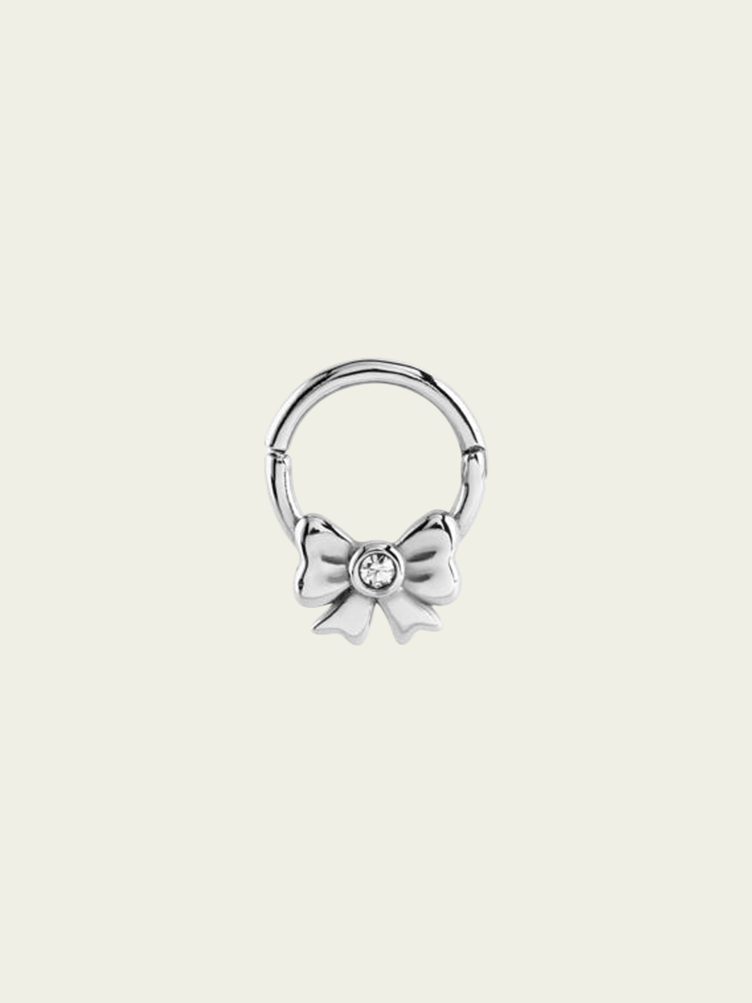 Argolla clicker moño con circonia blanca. Este tipo de piercing se puede usar en las perforaciones: septum, daith, hélix y lóbulo