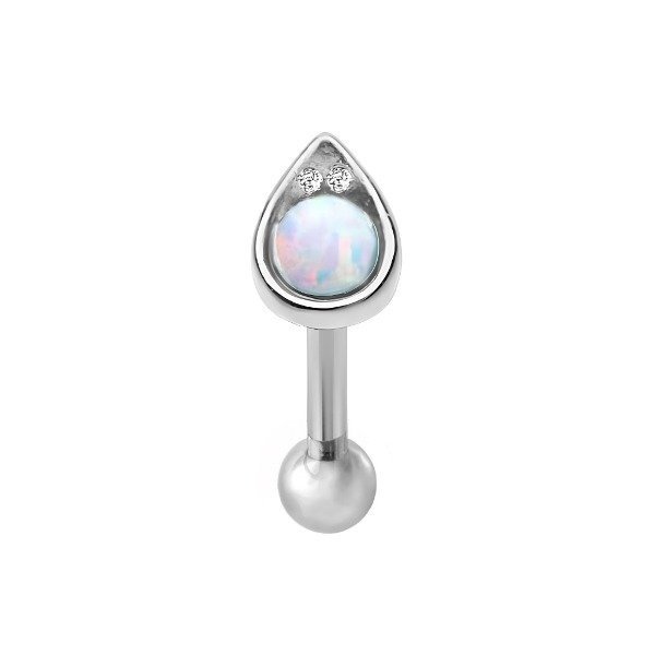 Piercing con forma de gota con ópalo en el centro y mini cubics blancos. Este tipo de piercing se puede usar en las perforaciones: flat, hélix, conch y lóbulo