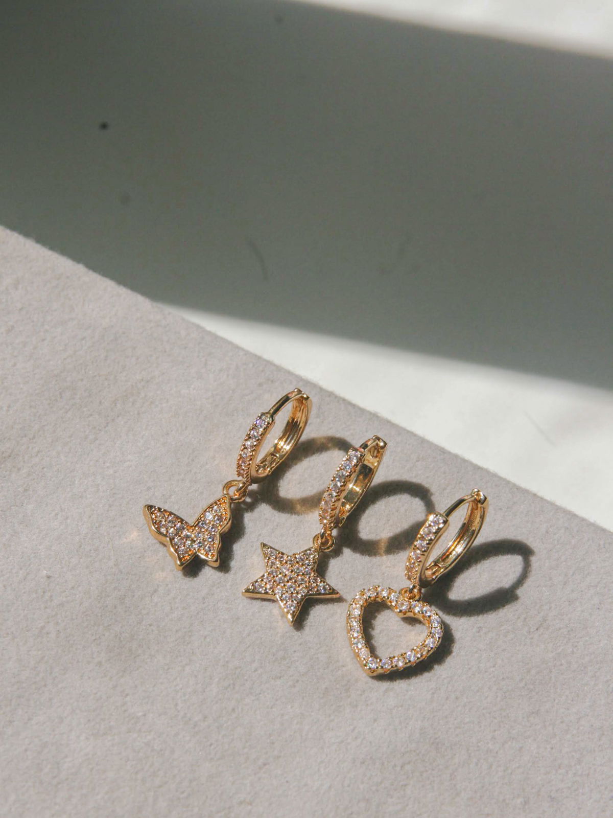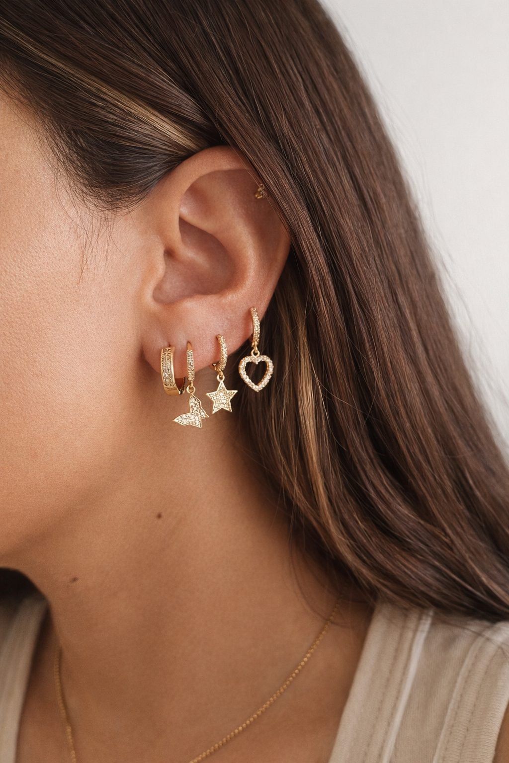 Argolla estilo huggie con circonitas blancas dije colgante. Este modelo se puede utilizar en las perforaciones: 1er, 2do y 3er lóbulo (ver foto abajo)