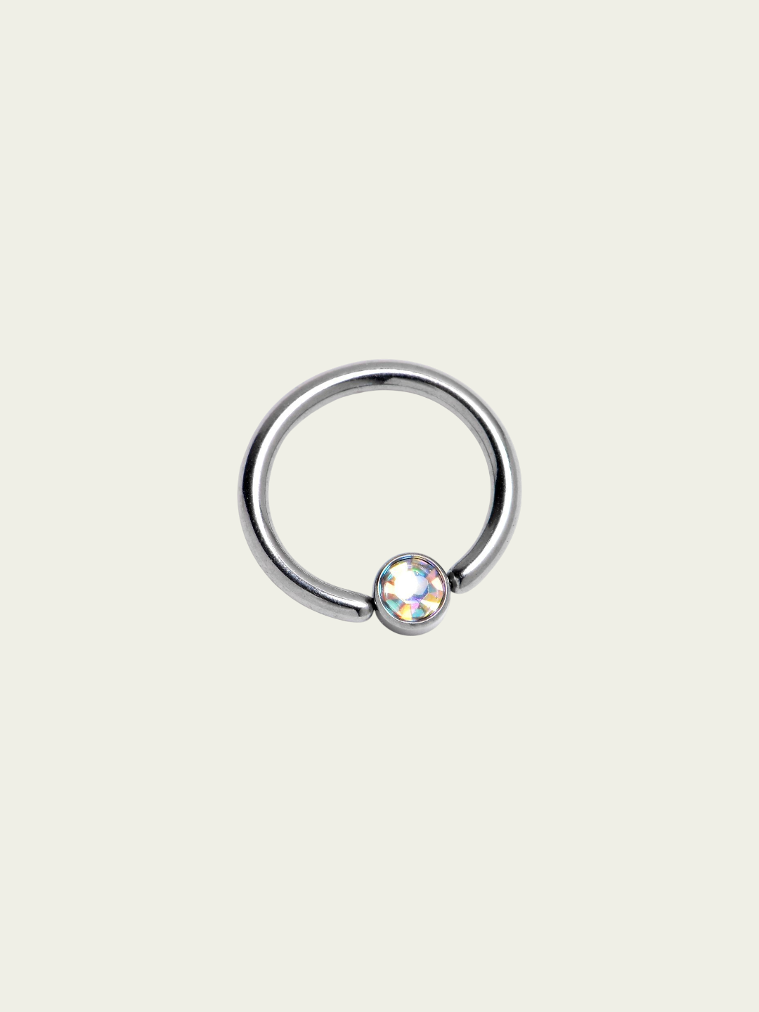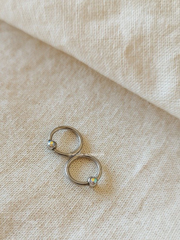 BCR con bolita strass tornasolado. La bola se saca completamente para colocarte el aro, luego pones la bola haciendo presión logrando que se encastre. Este tipo de piercing se puede usar en las perforaciones: hélix, conch, pezón, septum, ombligo y lóbulo