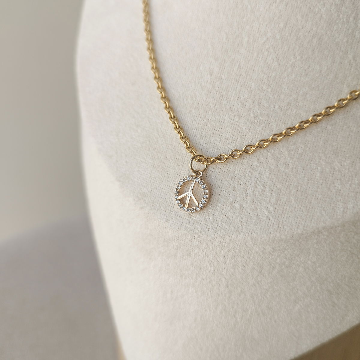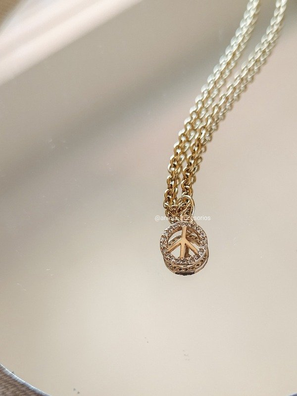 El collar PEace está diseñado con una cadena cortita (40cm) y medalla del símbolo de paz con circonitas blancas.