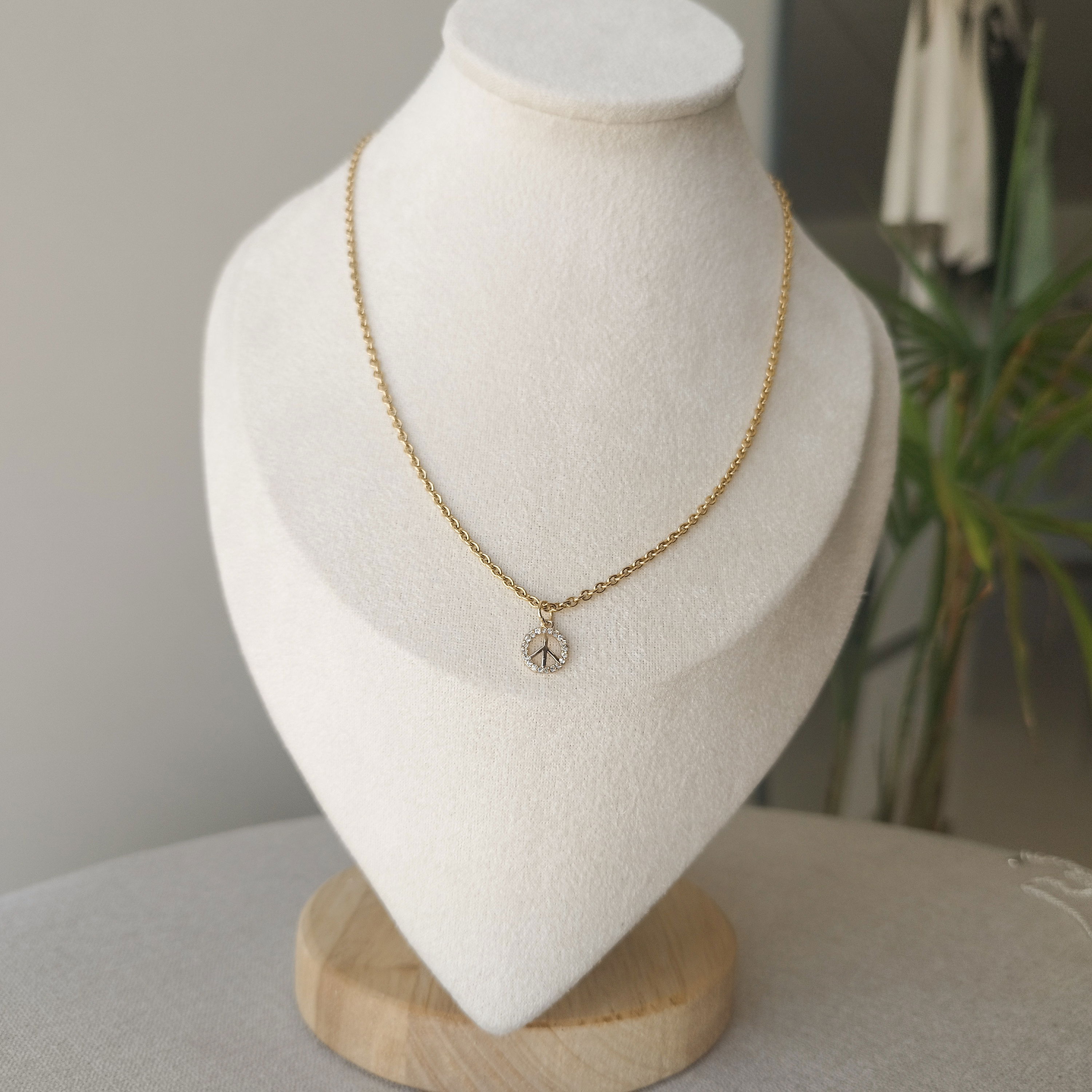 El collar PEace está diseñado con una cadena cortita (40cm) y medalla del símbolo de paz con circonitas blancas.