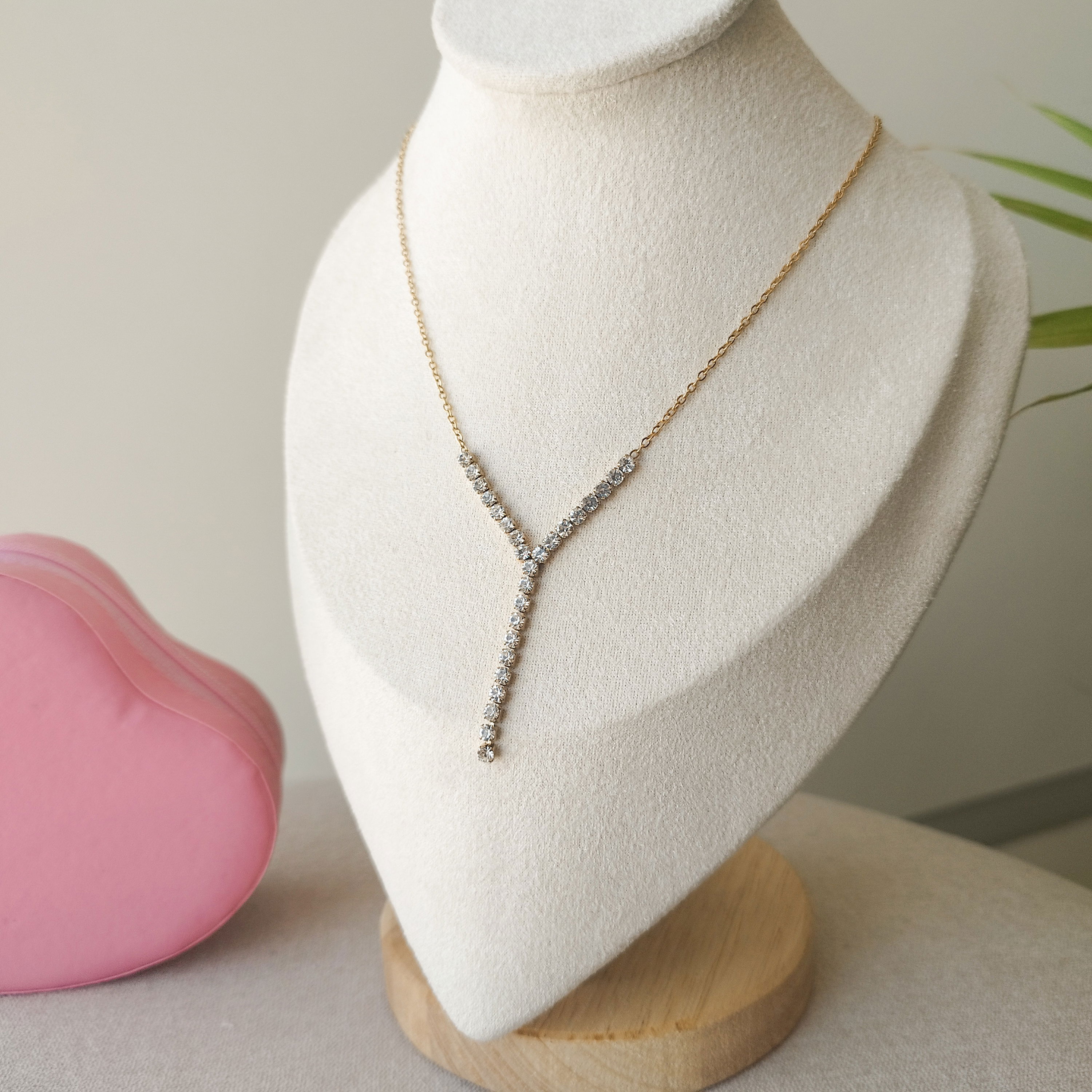 El collar Ivanna, diseñado con una fina cadena y terminación de circonitas en color blanco. Con su forma "Y" es ideal para escotes pronunciados