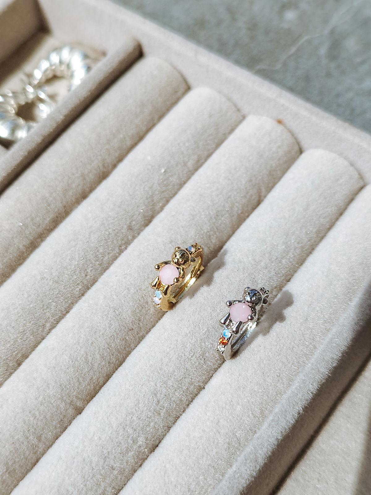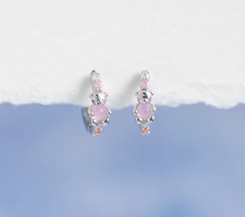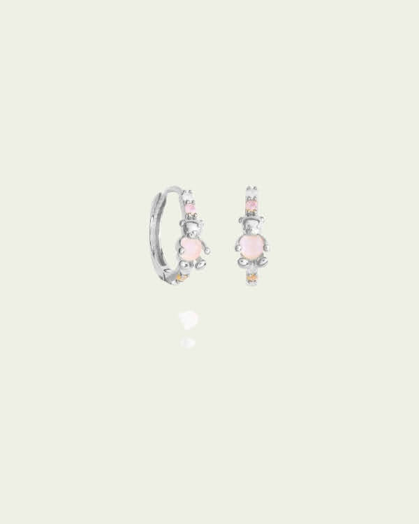 Argollas con dije osito y ópalo en el centro, zirconias de colores. Por su tipo de cierre son super comodas. Este modelo se puede utilizar en las perforaciones: 1er, 2do y 3er lóbulo (ver foto abajo)