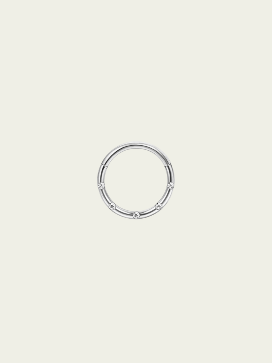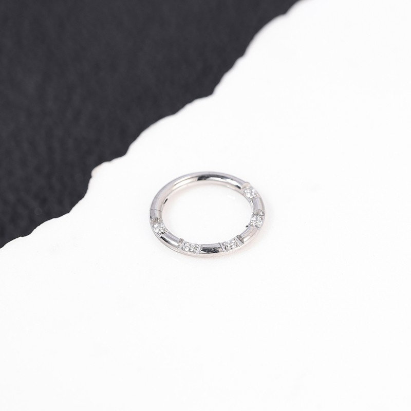 Argolla clicker con circonitas blancas frontales. Este tipo de piercing se puede usar en las perforaciones: daith, hélix, septum, y lóbulo