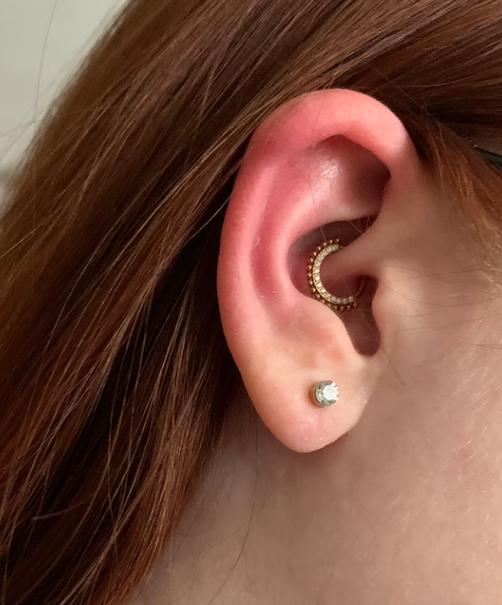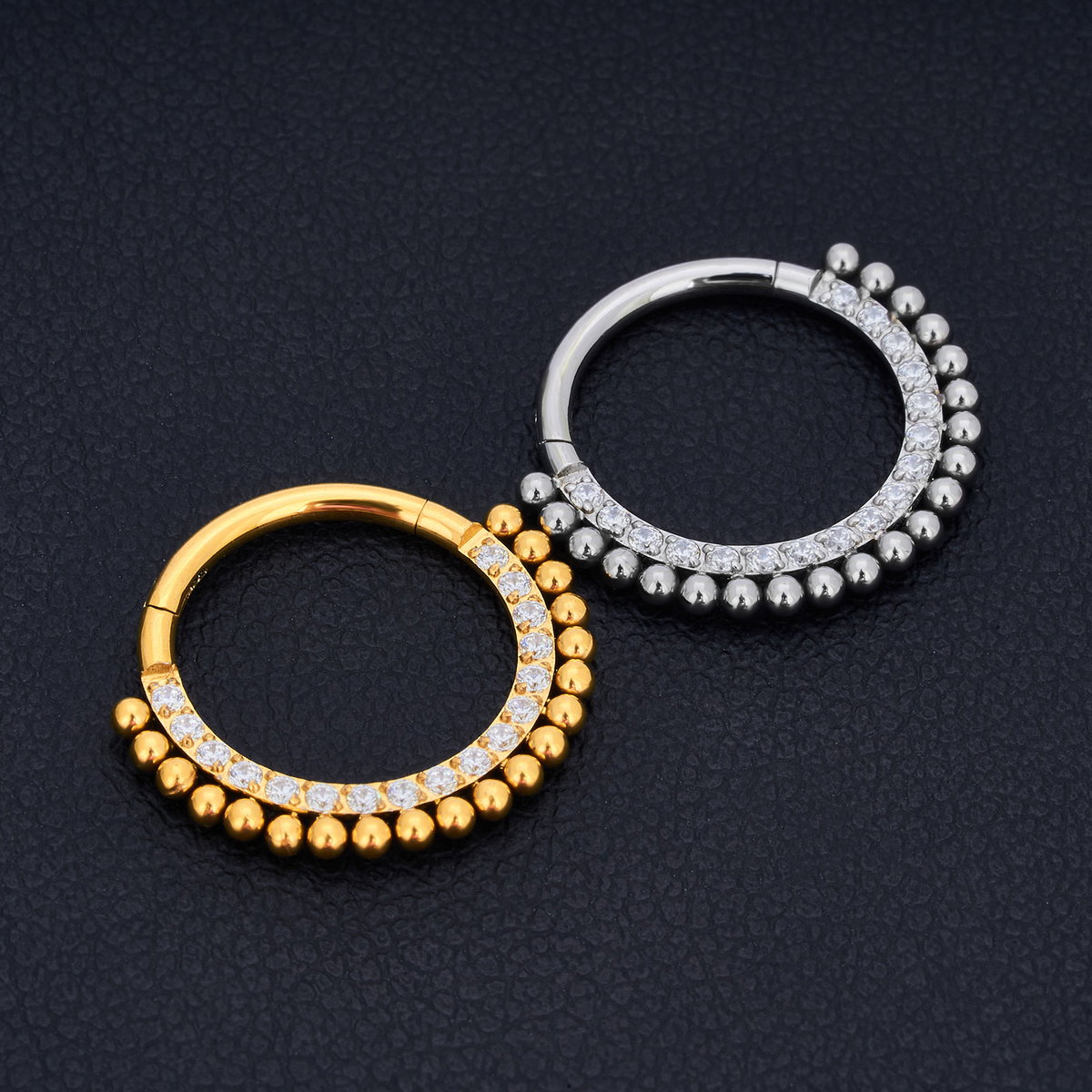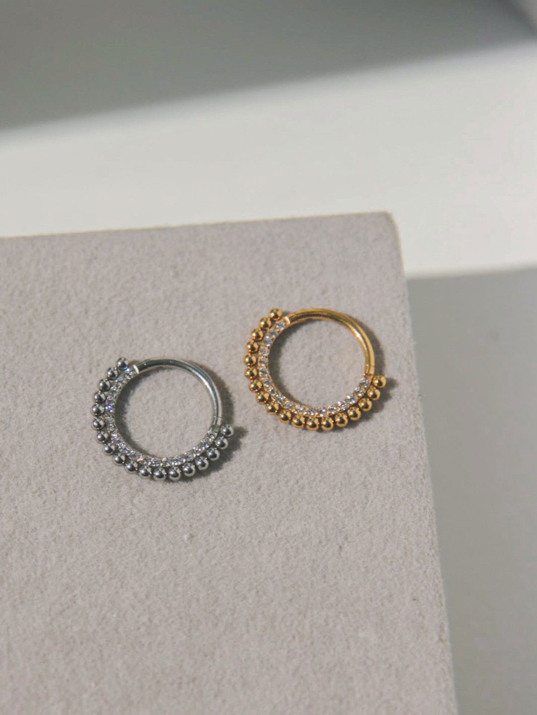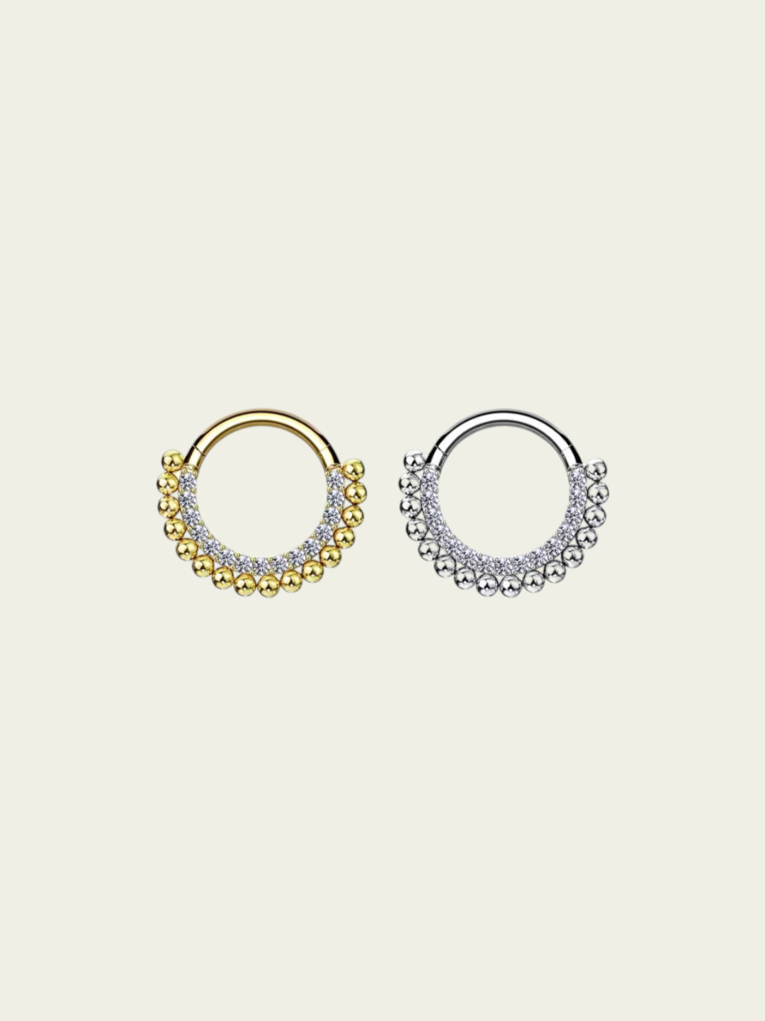 Argolla clicker con filigranas y cubics. Este tipo de piercing se puede usar en las perforaciones: septum, daith, hélix y lóbulo