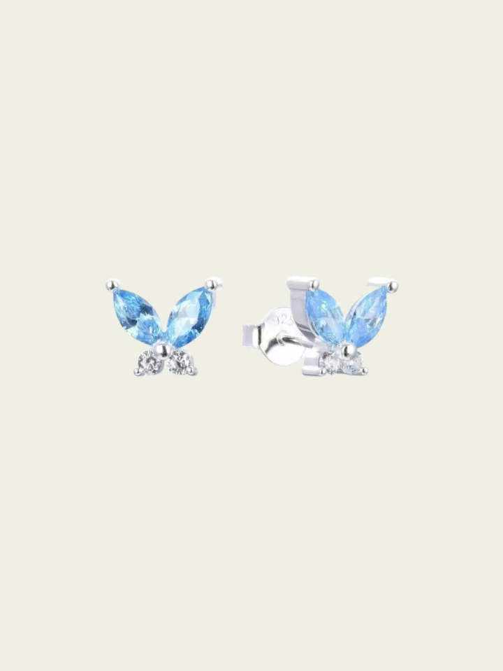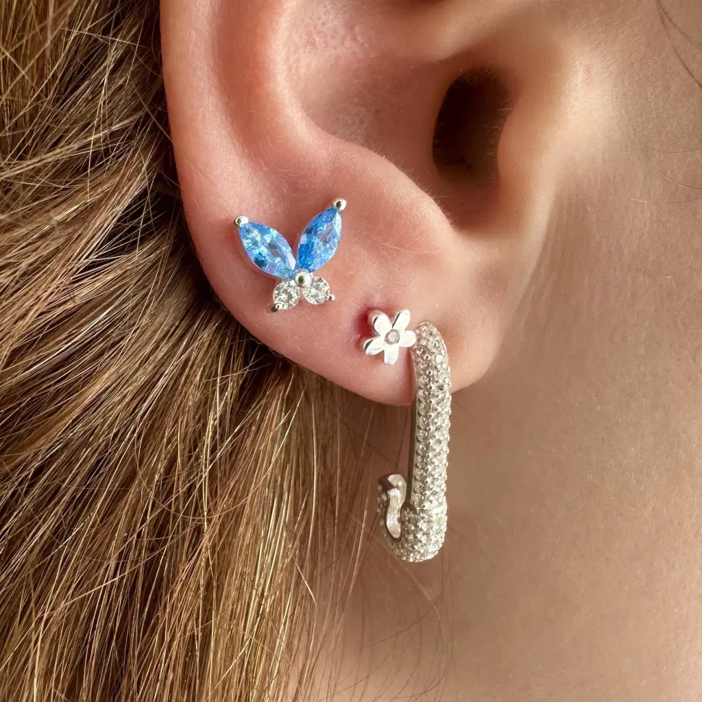 Aro Mariposa con cubic color celeste y mini circonitas redondas. Este modelo se puede utilizar en las perforaciones: 1er, 2do, 3er y 4to lóbulo (ver foto abajo)