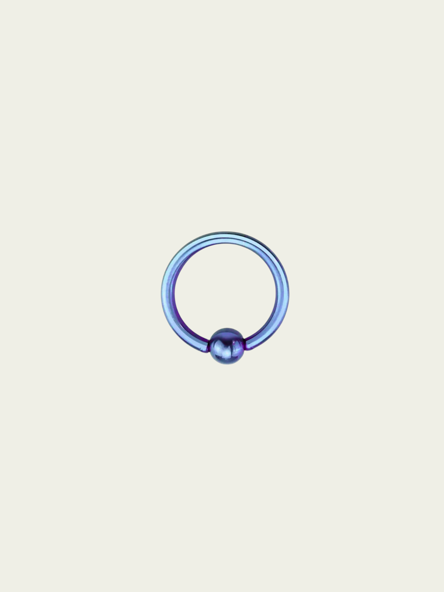 BCR clásico con cierre bolita. La pelotita se saca completamente para colocarte el aro, luego lo volves a colocar haciendo presión logrando que se encastre. Este tipo de piercing se puede usar en las perforaciones: hélix, conch, pezón, septum, ombligo y lóbulo
