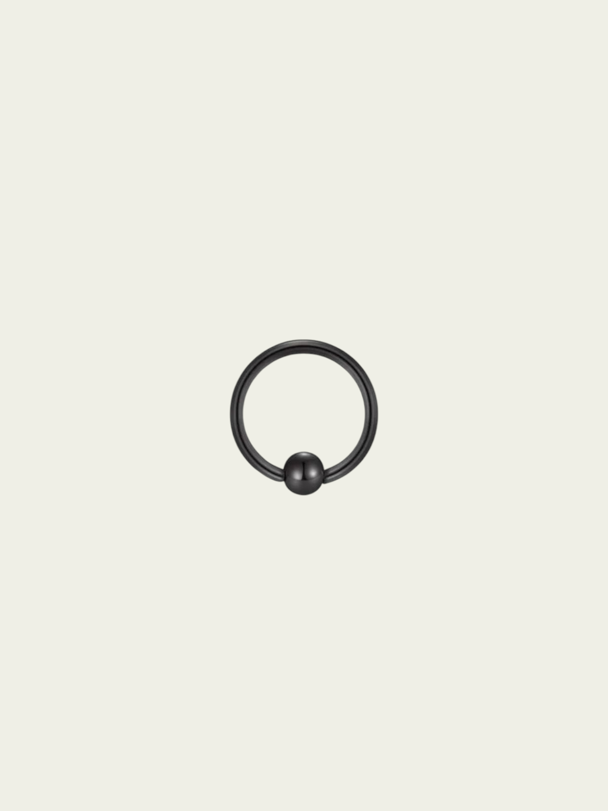 BCR clásico con cierre bolita. La pelotita se saca completamente para colocarte el aro, luego lo volves a colocar haciendo presión logrando que se encastre. Este tipo de piercing se puede usar en las perforaciones: hélix, conch, pezón, septum, ombligo y lóbulo