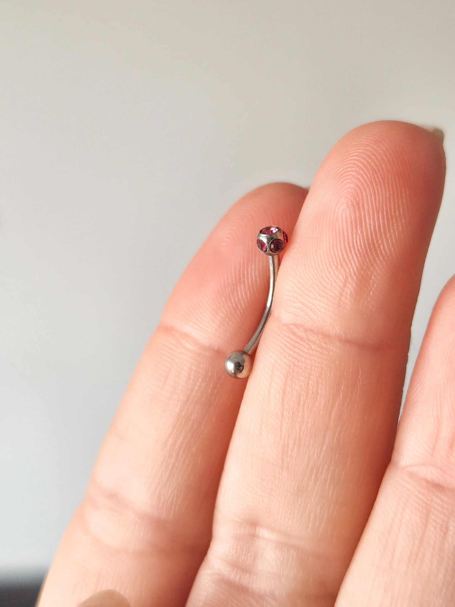 Aro barbell curvo clásico con cubics rosas. Este tipo de piercing se puede usar en las perforaciones: rook, anti tragus, ceja, ashley y ombligo
