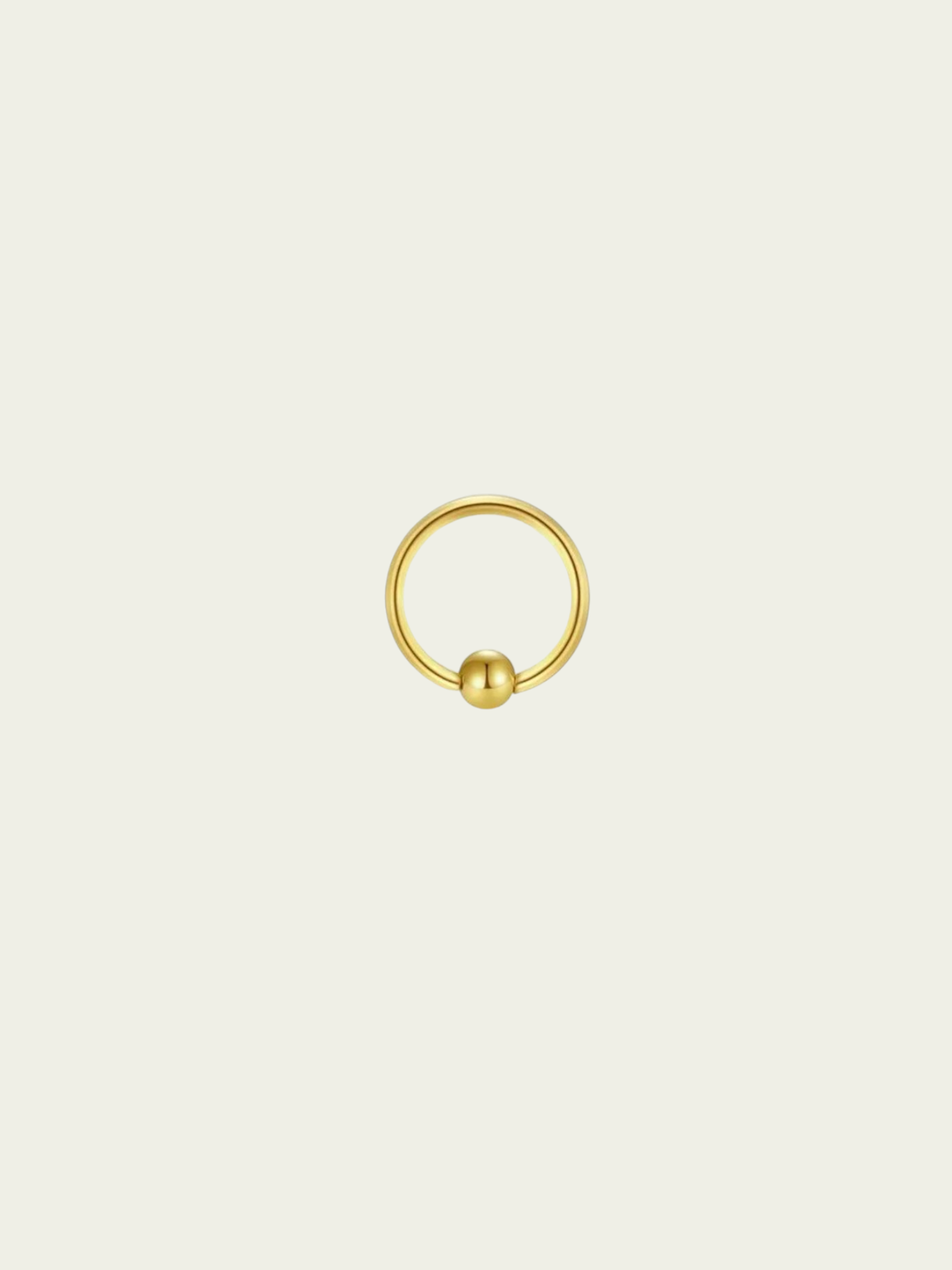 BCR clásico con cierre bolita. La pelotita se saca completamente para colocarte el aro, luego lo volves a colocar haciendo presión logrando que se encastre. Este tipo de piercing se puede usar en las perforaciones: 1er, 2do y 3er lóbulo, hélix, conch, septum, ombligo y lóbulo