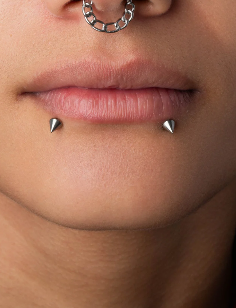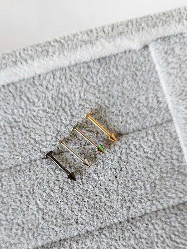 Piercing labret en forma de punta. Este tipo de piercing se puede usar en las perforaciones: flat, hélix, contra helix, medusa, tragus, conch y lóbulo