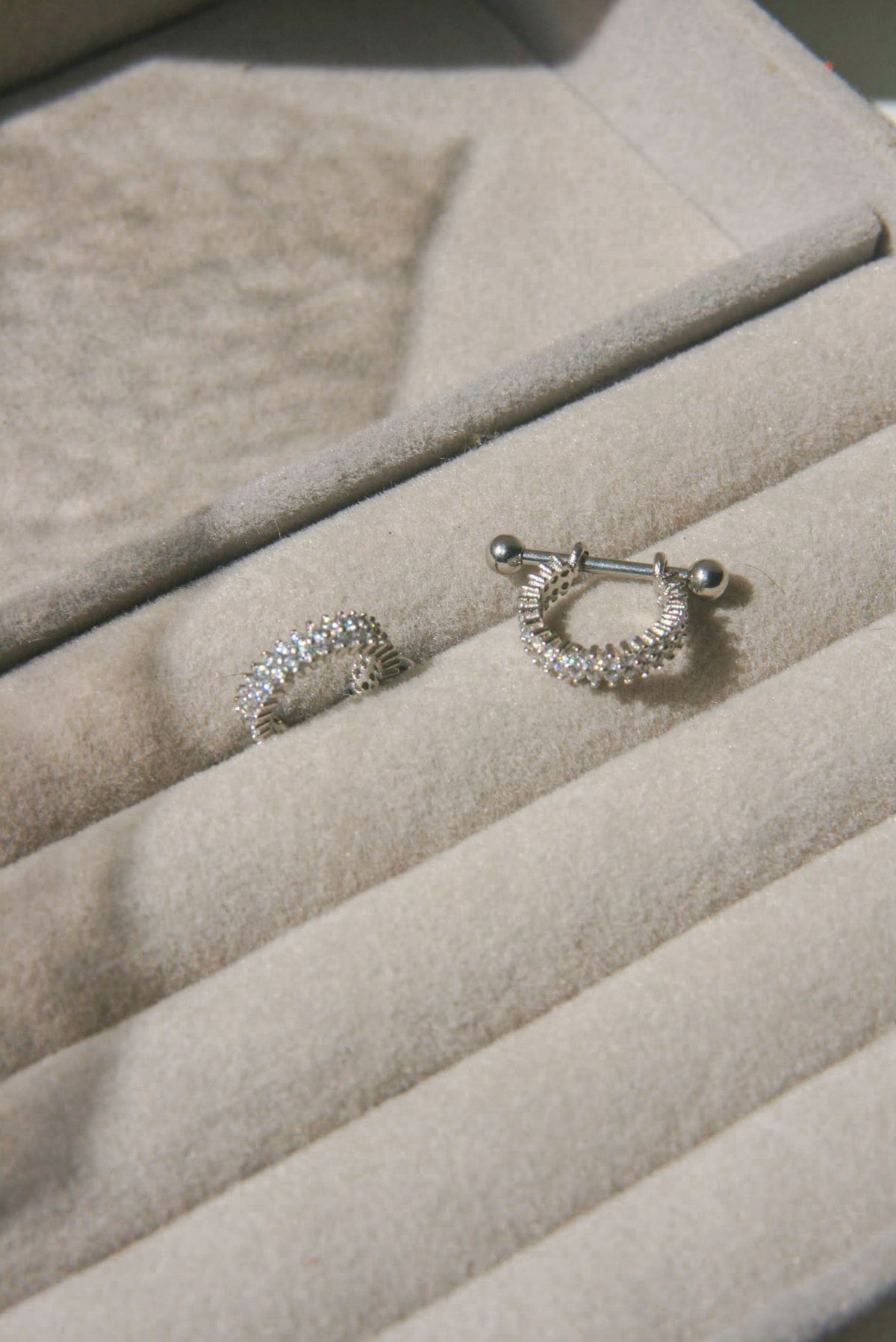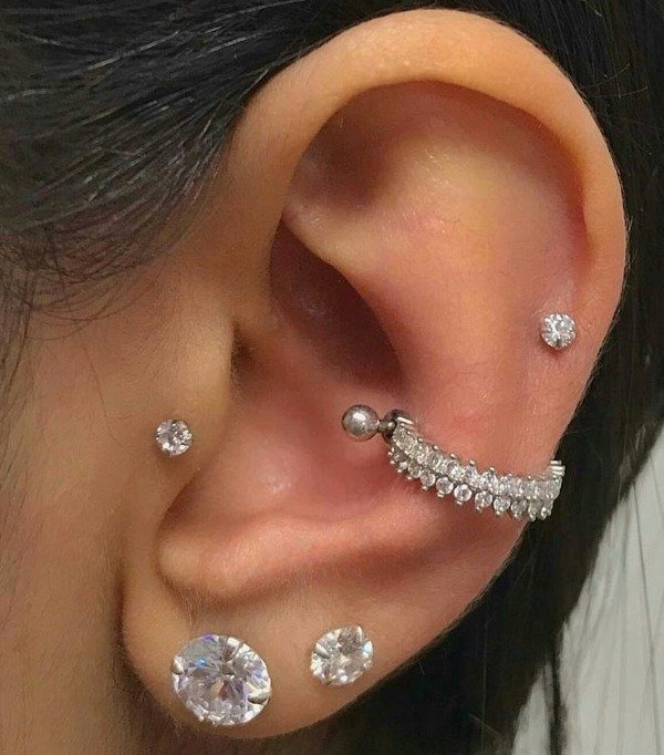 Piercing barbell con semi argolla con circonitas blancas incrustadas. Este tipo de piercing se puede usar en las perforaciones: nipple, hélix, conch y lóbulo