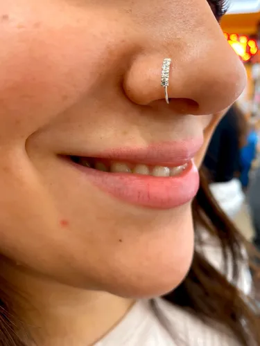Argolla sin fin lisa con 5 cubics engarzados, son de sus favoritas! Se pueden llevar en la nariz, cartílago, lóbulo superior o tragus, tambien se pueden usar en el ombligo. Este tipo de argollas son sin fin y se abren para el costado para que no pierdan su forma! Este modelo se puede utilizar en las perforaciones: hélix, contra hélix, tragus, nostril, boca, 3er lóbulo (ver foto abajo)