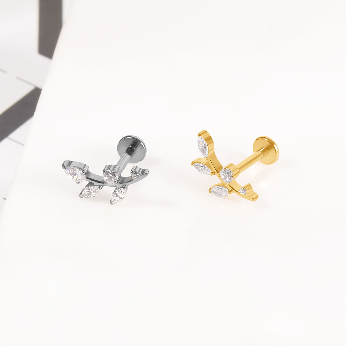 Piercing labret Ramito con circonitas blancas. Estilo trepador. Este tipo de piercing se puede usar en las perforaciones: flat, hélix, conch y lóbulo