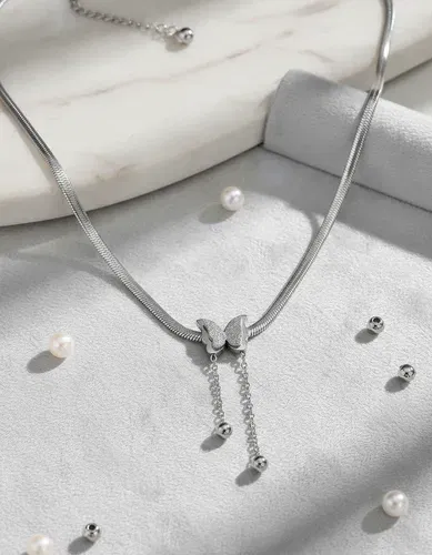 El collar aixa está diseñado con nuestra cadena snake y un dije de mariposa super lindo con cadenas colgantes y bolita