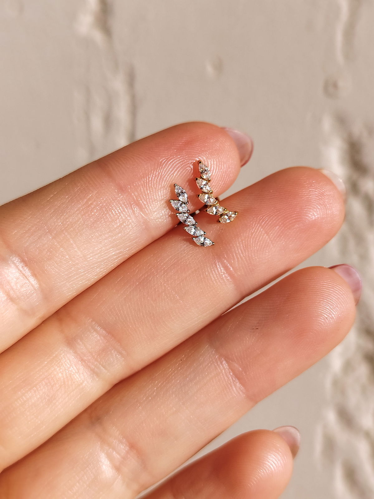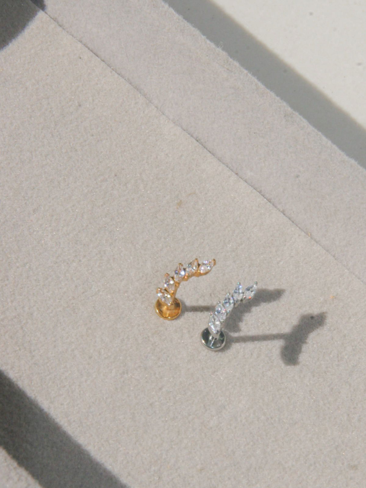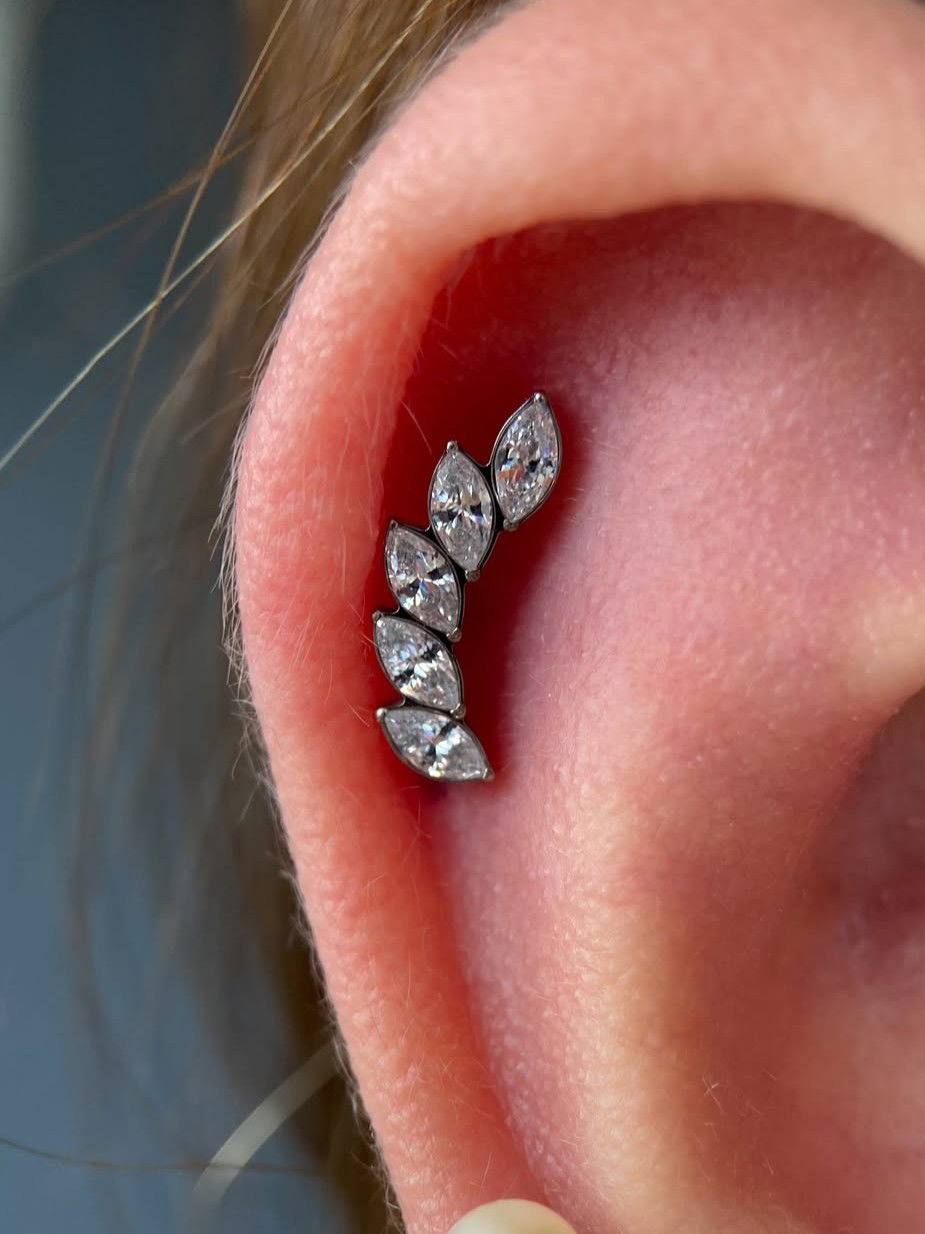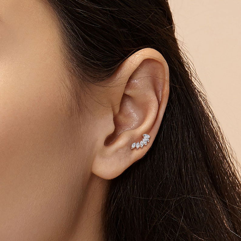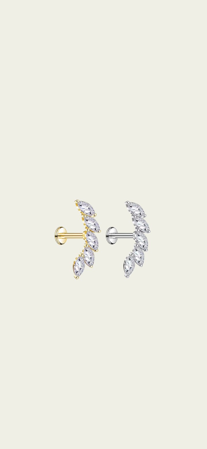 Piercing labret circonias blancas, con estilo trepador. Este tipo de piercing se puede usar en las perforaciones: flat, hélix, contra hélix, conch y lóbulo