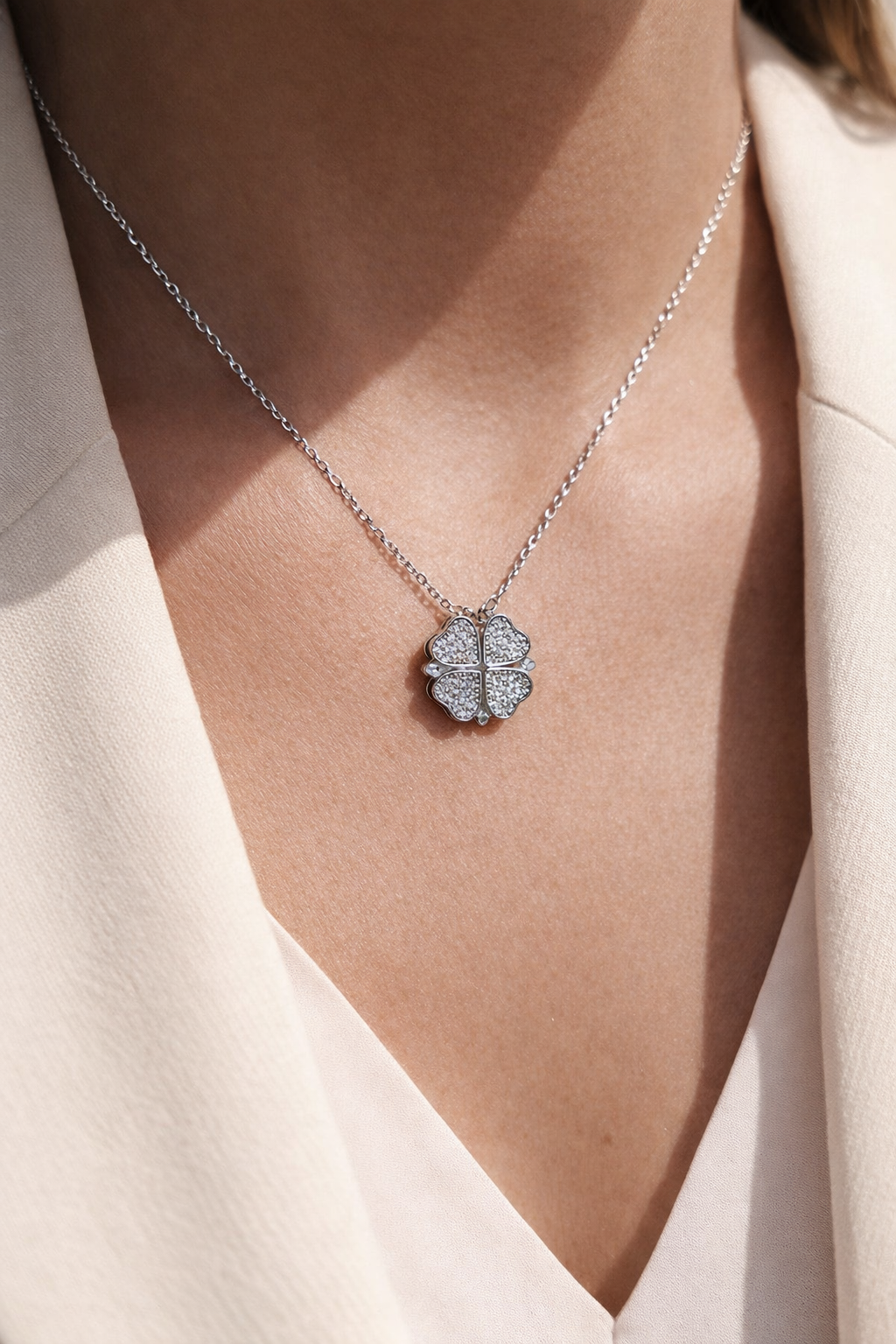 Este collar esta diseñado con un dije de trébol de cuatro hojas unido con imanes
