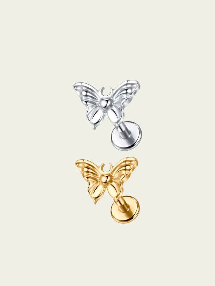 Piercing labret Mariposa con detalles. Este piercing se puede usar en las perforaciones: 1er, 2do y 3er lobulo, flat, conch y hélix (ver foto abajo)