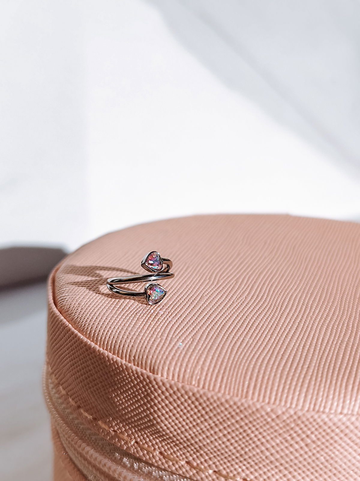 Argolla clicker con cubic corazón tornasolados, cambia el color segun la luz. Este tipo de piercing se puede usar en las perforaciones: lóbulo y hélix, conch