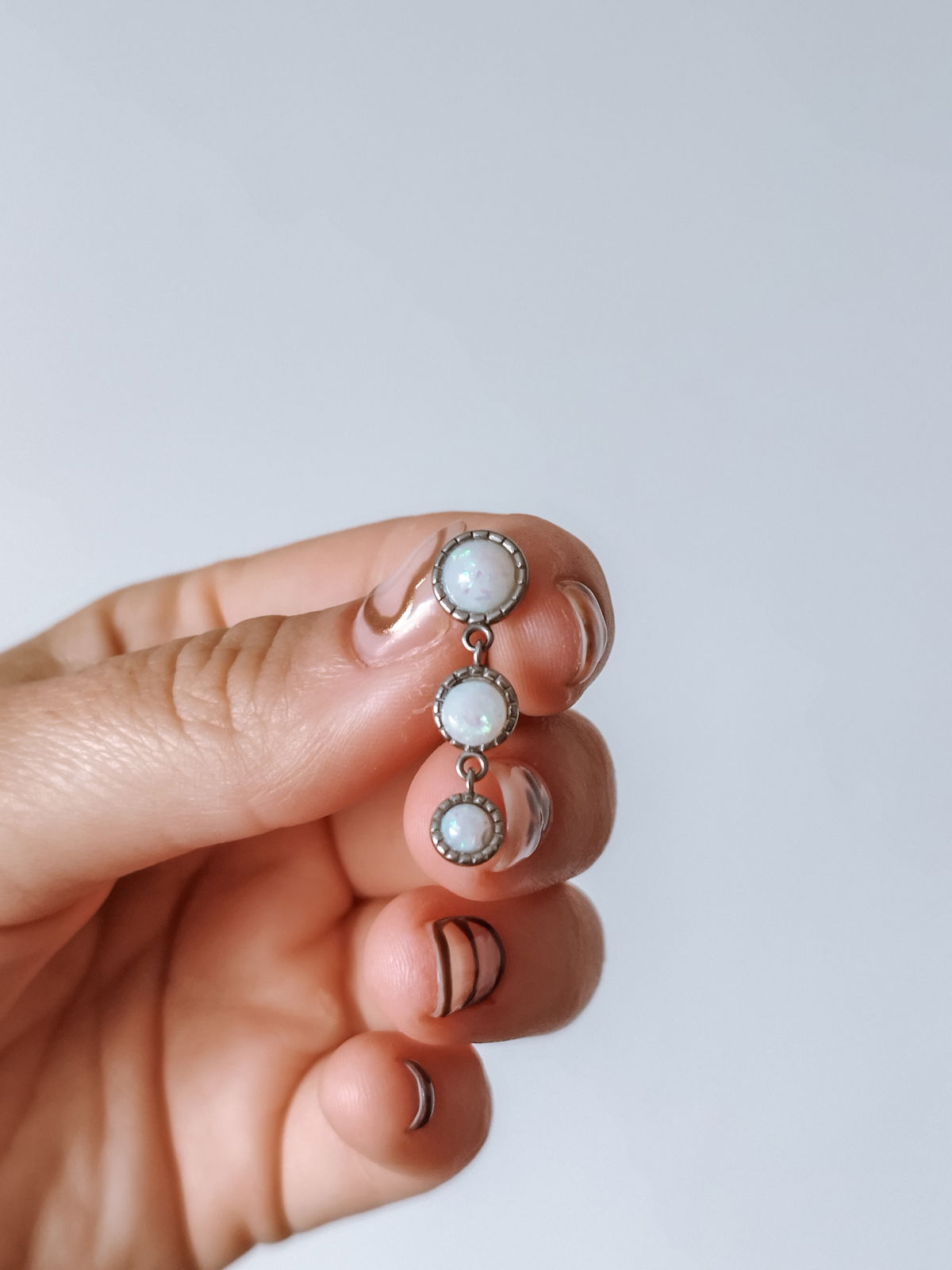 Piercing colgante con tres ópalos. Este tipo de piercing se puede usar en la perforación del ombligo
