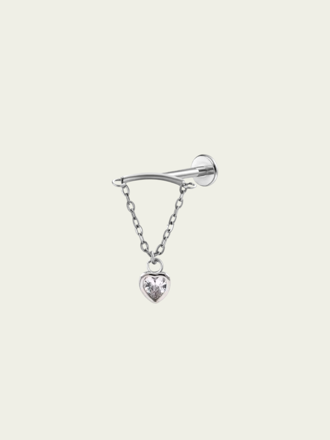 Piercing labret barra con cadena y dije corazón. Este tipo de piercing se puede usar en las perforaciones: flat, hélix, hélix vertical y lóbulo