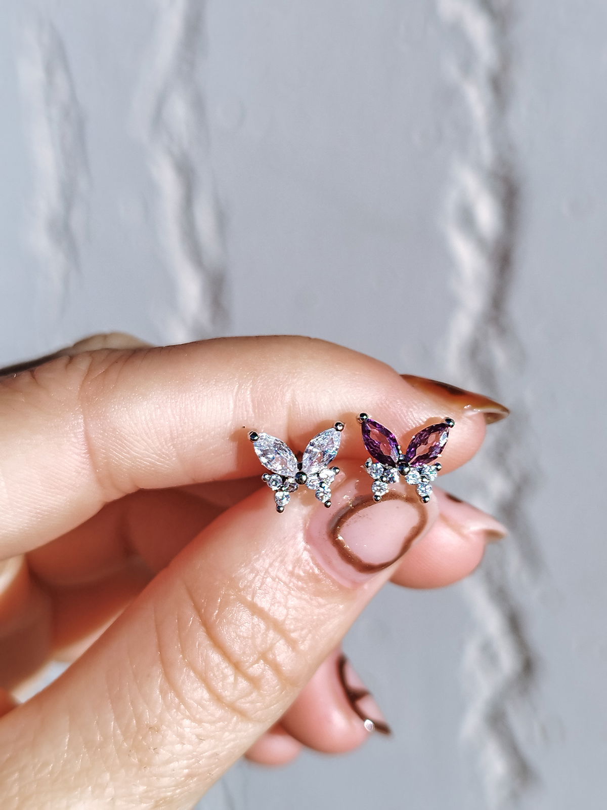 Piercing barbell Mariposa color rosa/violeta y cubics blancos. Este tipo de piercing se puede usar en las perforaciones: flat, hélix, conch y lóbulo