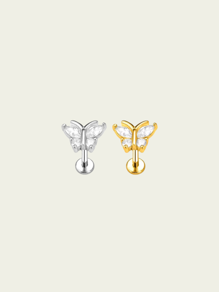 Piercing labret mariposa con cubic. Este tipo de piercing se puede usar en las perforaciones: flat, hélix, conch, contra hélix, tragus y lóbulo