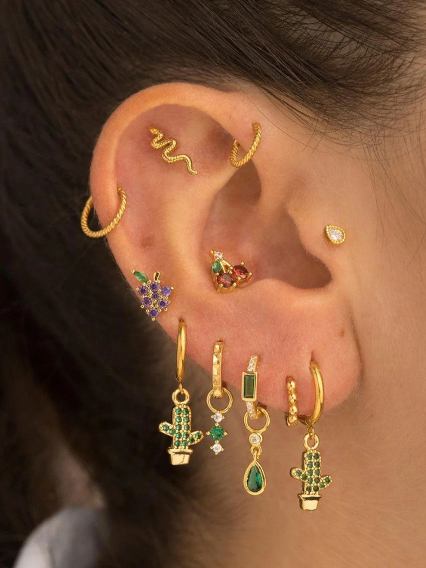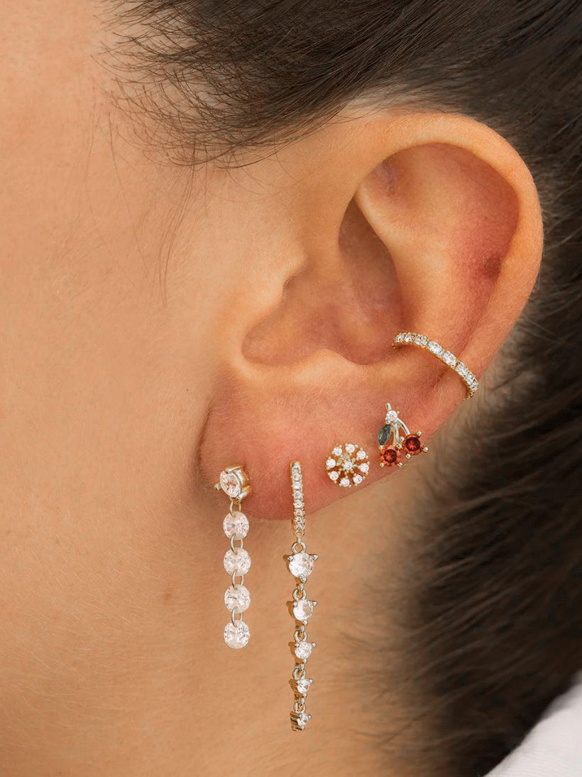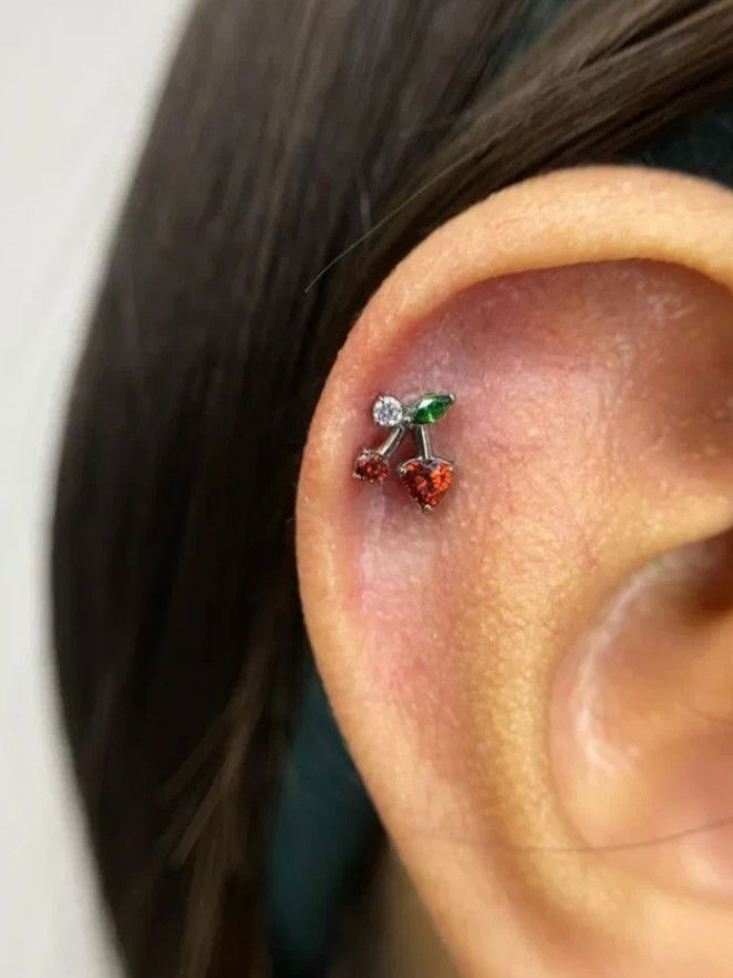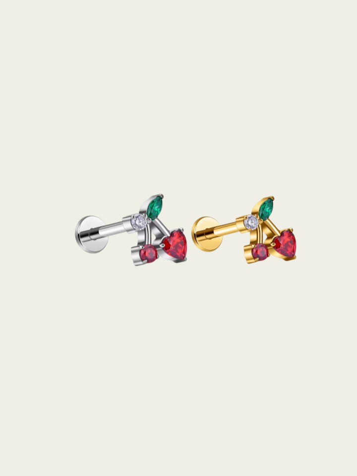 Piercing labret cereza con circonias de color rojo, con forma de corazón y redondo. Este tipo de piercing se puede usar en las perforaciones: flat, hélix, conch y lóbulo