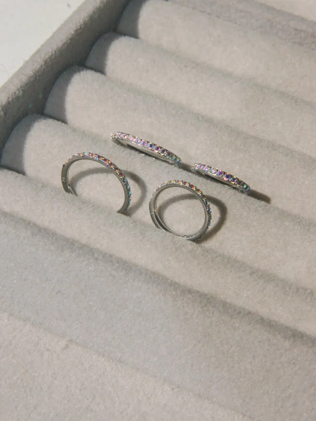 Tipo de cierre: Segmentada. Este tipo de aros tienen una bisagra que al cerrar quedan como argollitas sin fin. Es uno de los cierres más cómodos y seguros de llevar!