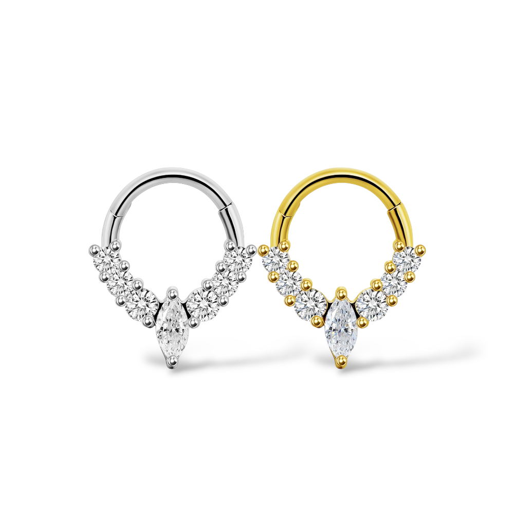 Argolla clicker cubics. Este tipo de piercing se puede usar en las perforaciones: 1er, 2do y 3er lóbulo, hélix, septum y daith (ver foto abajo)