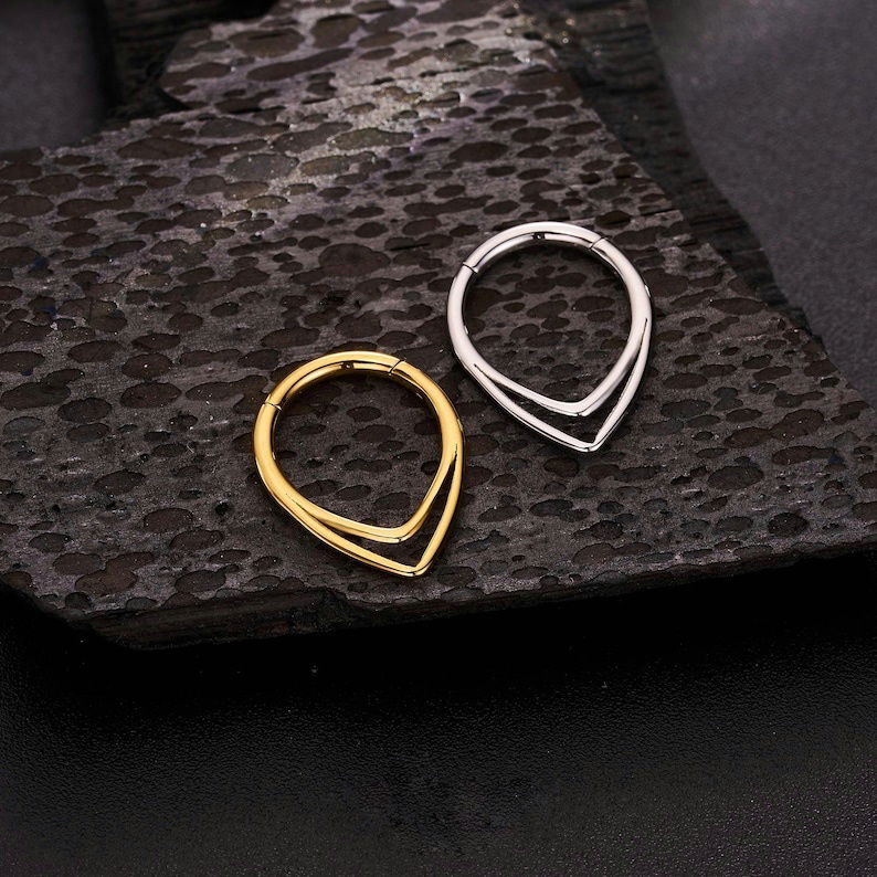 Argolla clicker lisa en V doble. Este tipo de piercing se puede usar en las perforaciones: 1er, 2do y 3er lóbulo, hélix, daith, septum (ver foto abajo)