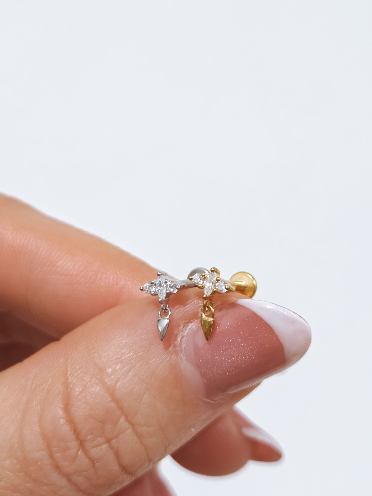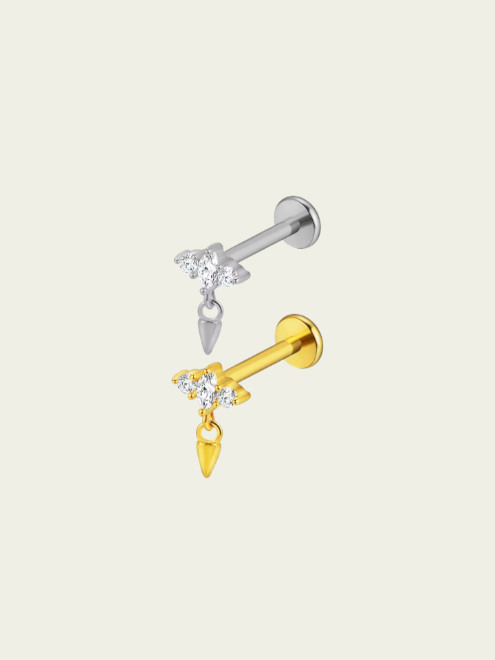 Piercing labret cubics con colgante. Este tipo de piercing se puede usar en las perforaciones: flat, hélix, contra hélix, conch, lóbulo y tragus