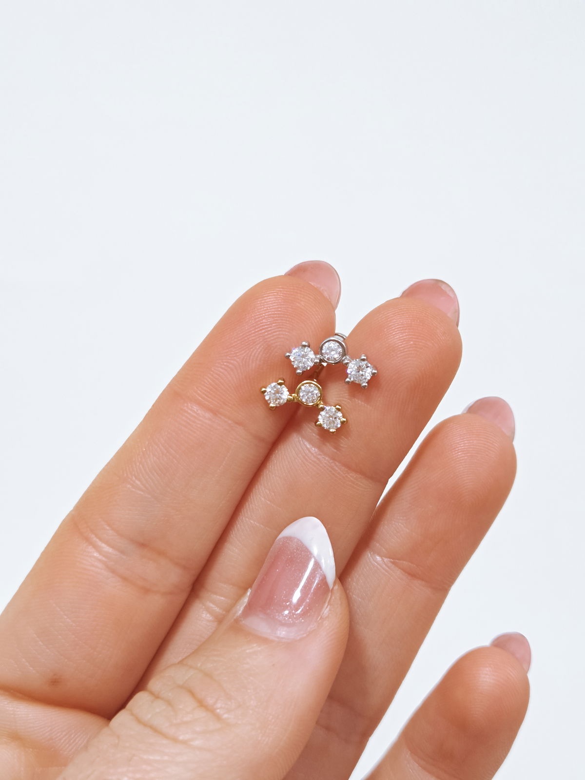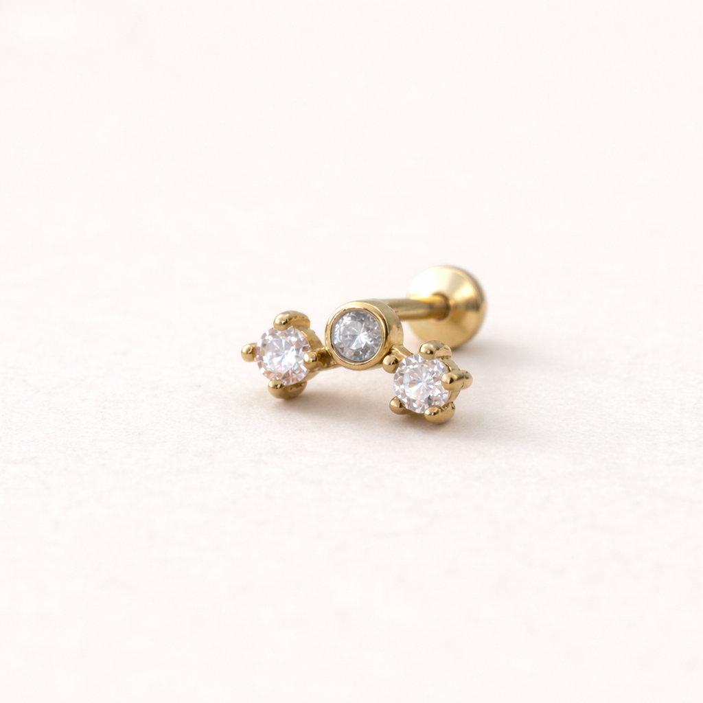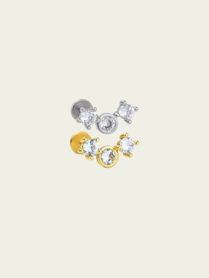 Piercing labret estilo trepador con cubics. Este tipo de piercing se puede usar en las perforaciones: flat, hélix, contra hélix, conch, lóbulo y tragus