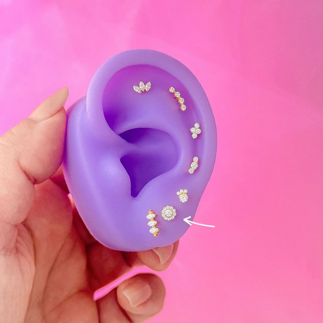 Piercing labret forma rayo liso. Este tipo de piercing se puede usar en las perforaciones: flat, hélix, conch, 1er, 2do y 3er lóbulo.