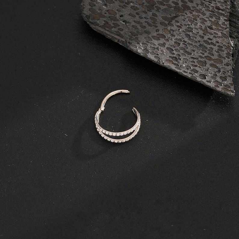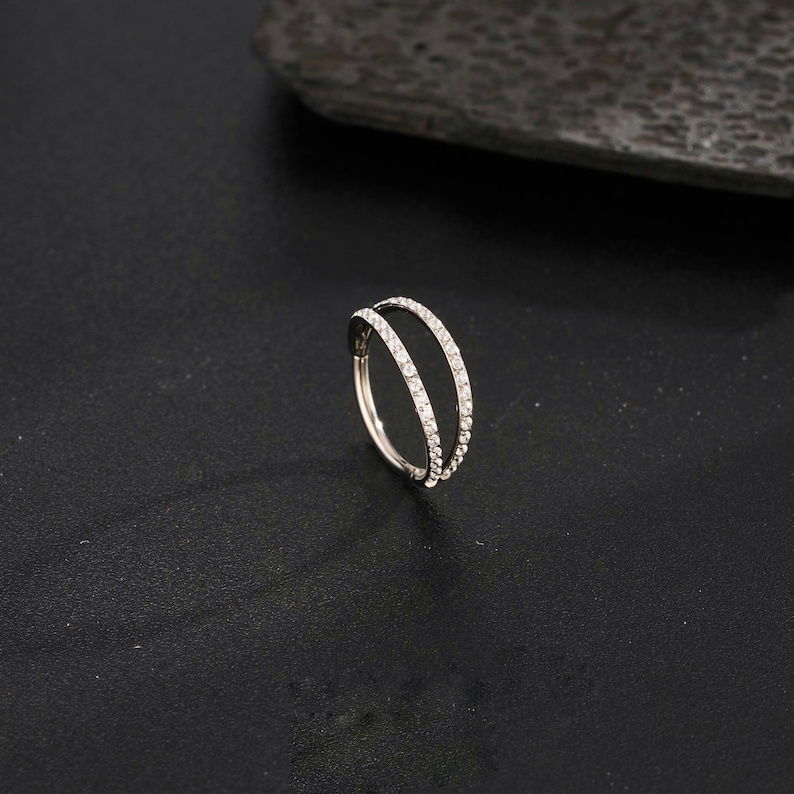 Argolla clicker doble con circonitas blancas. Este tipo de piercing se puede usar en las perforaciones: ombligo, tragus, rook, conch, hélix, contra hélix, 1er, 2do y 3er lóbulo