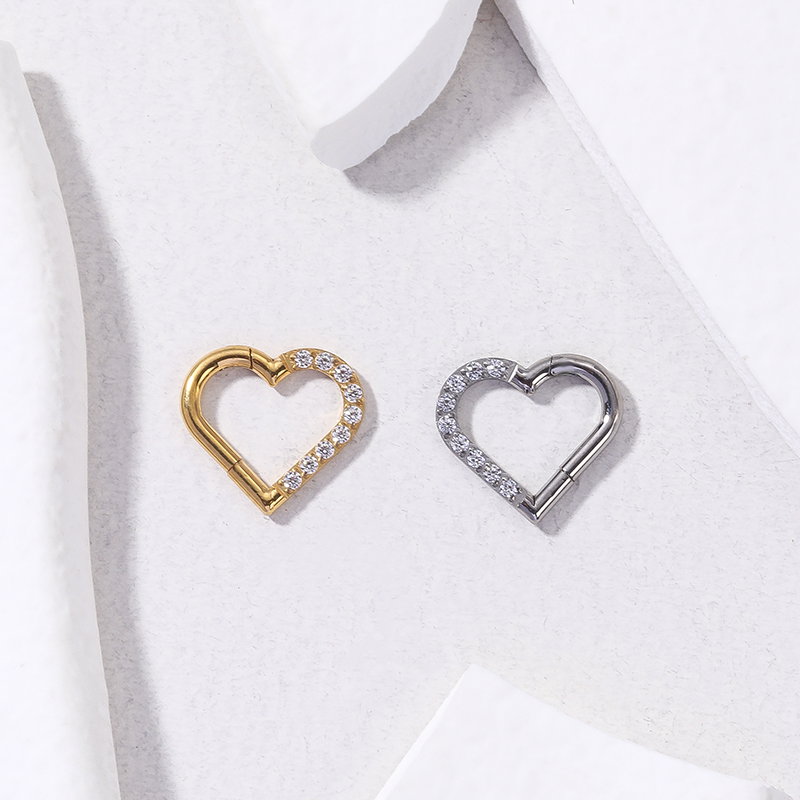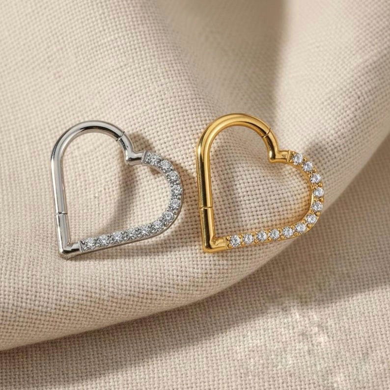 Argolla clicker corazón con circonitas blancas. Este tipo de piercing se puede usar en las perforaciones: daith, hélix, nariz y lóbulo