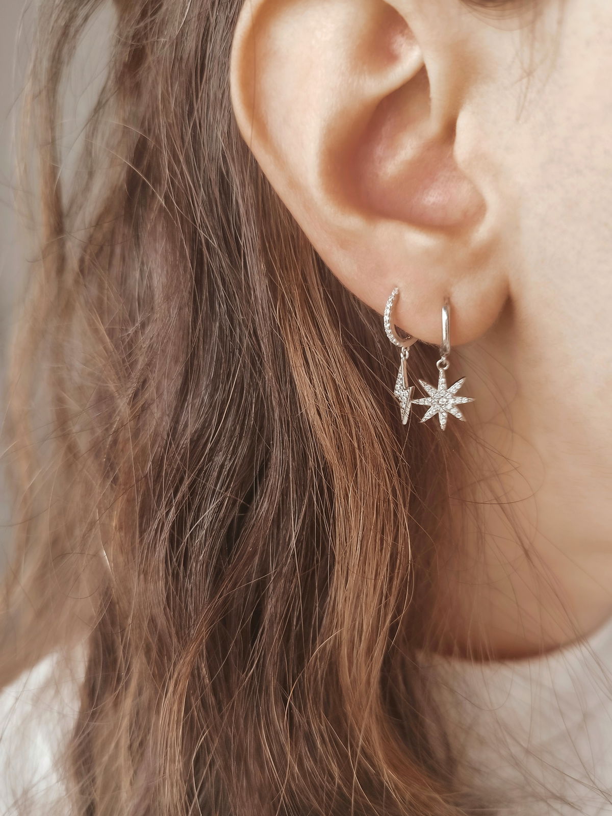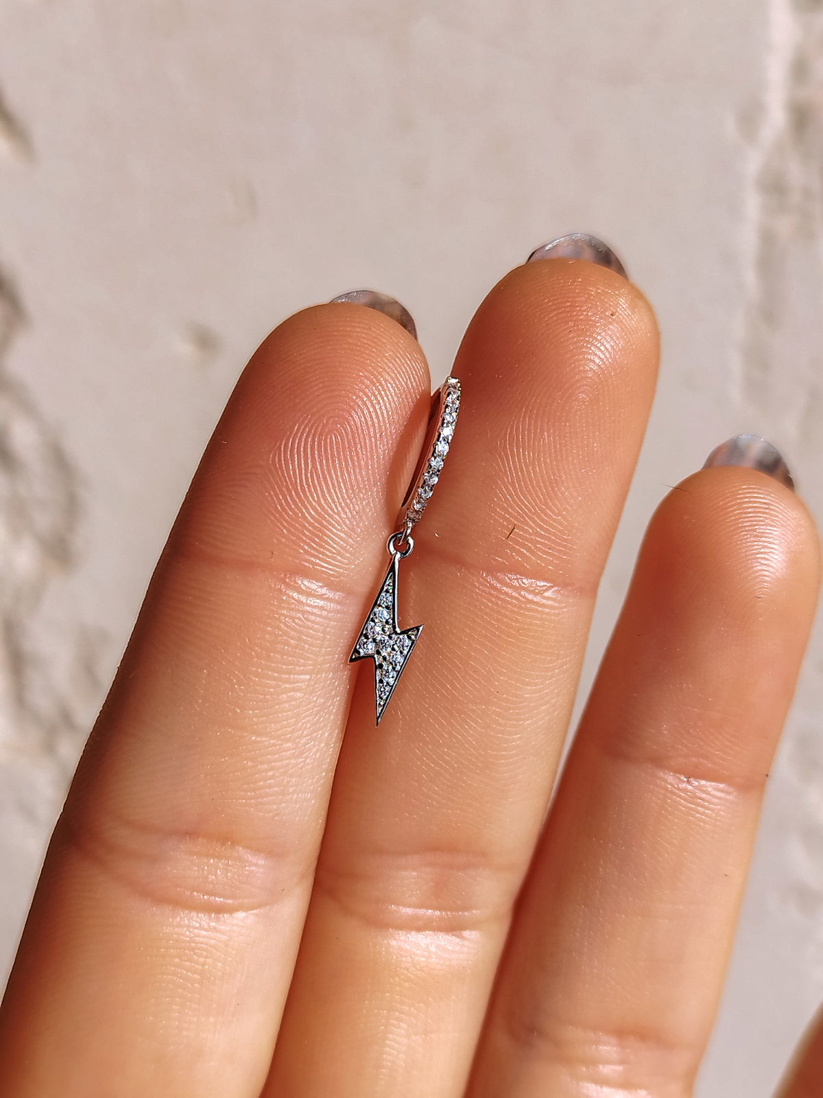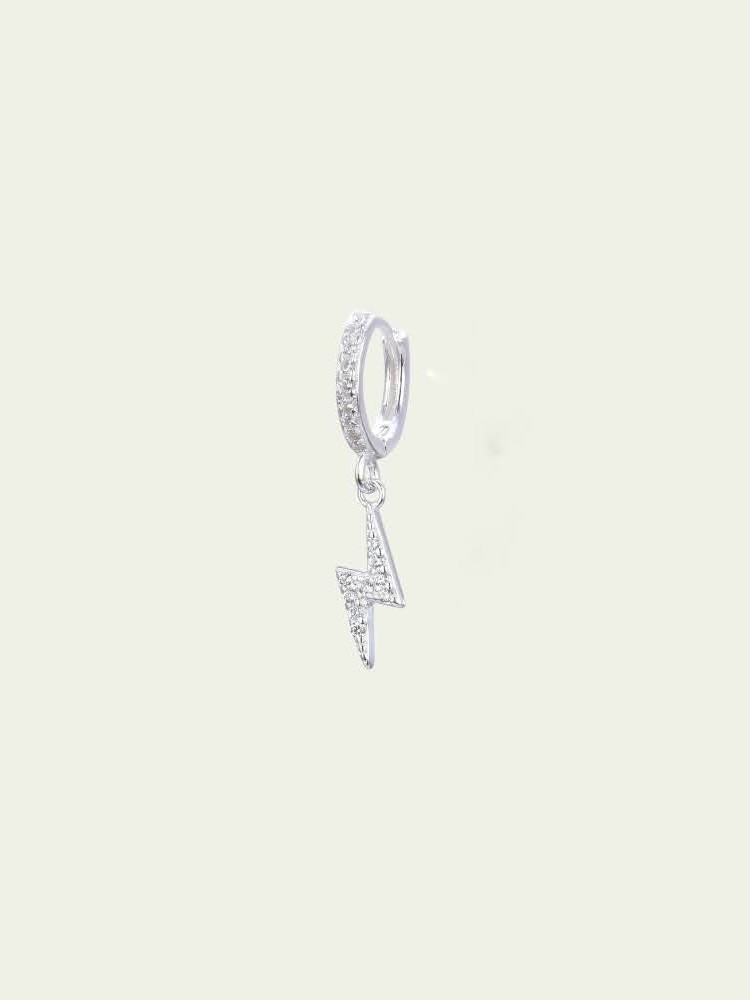 Argolla UNITARIA con circonitas blancas incrustadas y dije rayo con circonitas blancas. Quedan muy lindas combinadas la argolla drop, star o serena. Este modelo se puede utilizar en las perforaciones: 1er, 2do, 3er lobulo (ver foto abajo)