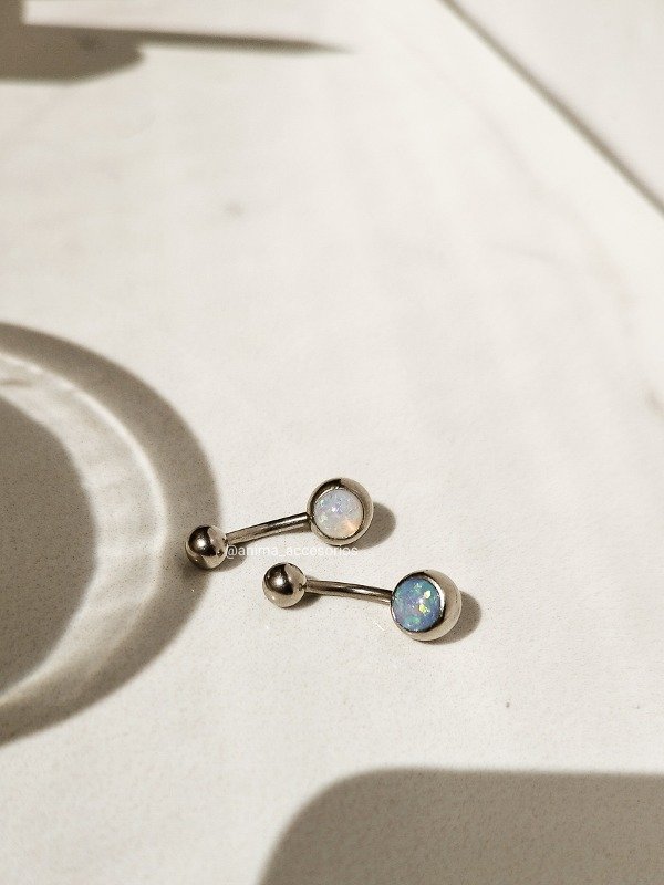 Piercing con ópalo celeste/blanco. Este tipo de piercing se puede usar en la perforación del ombligo