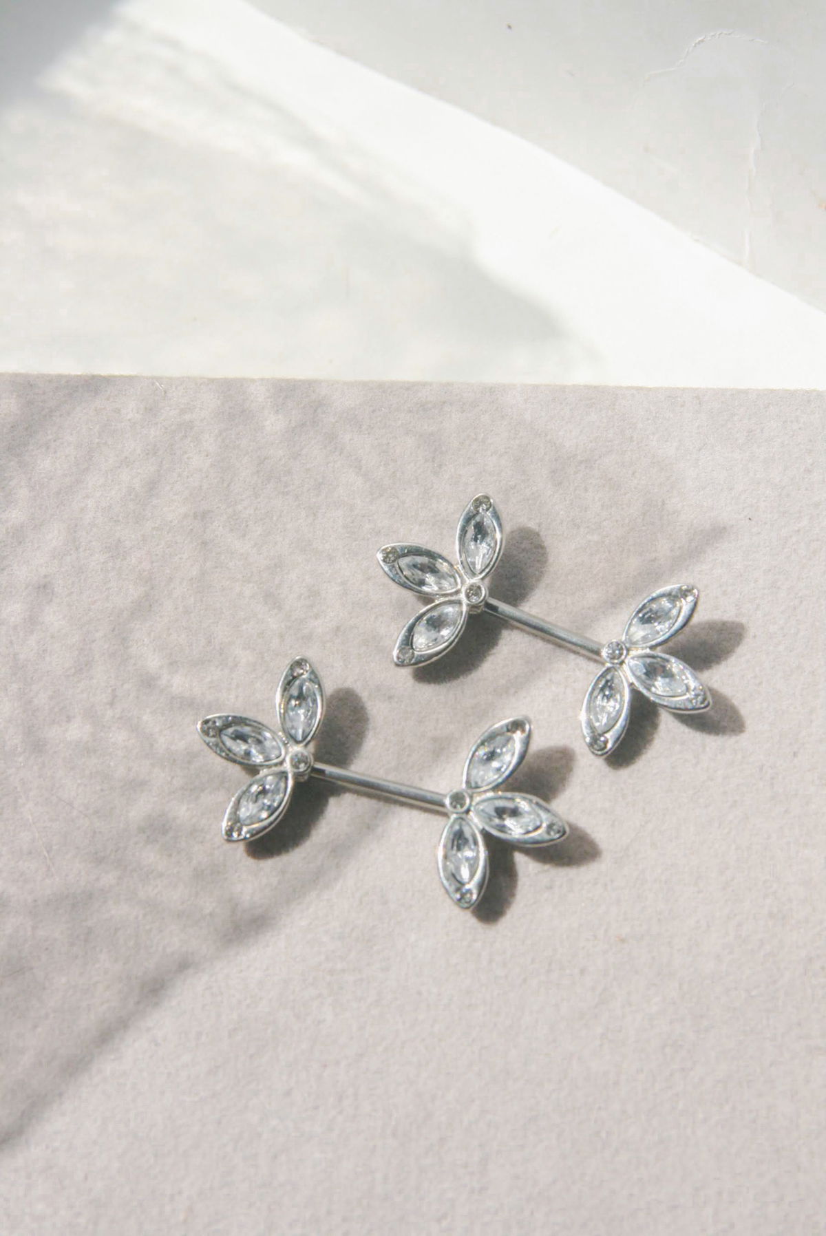Barbell recto para el pezón con flor cubic blanco. Este tipo de piercing se puede usar en la perforación del pezón