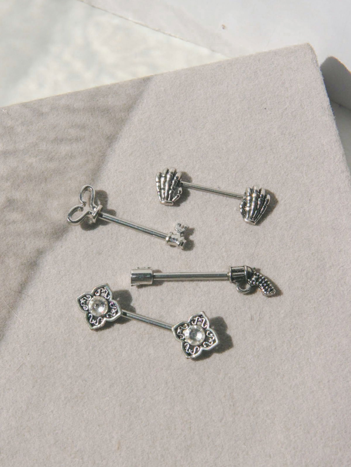 Pezoneras de esqueleto, pistola, flolr con cubic y llave. Seleccioná tu favorita. Este tipo de piercing se puede usar en la perforación del pezón