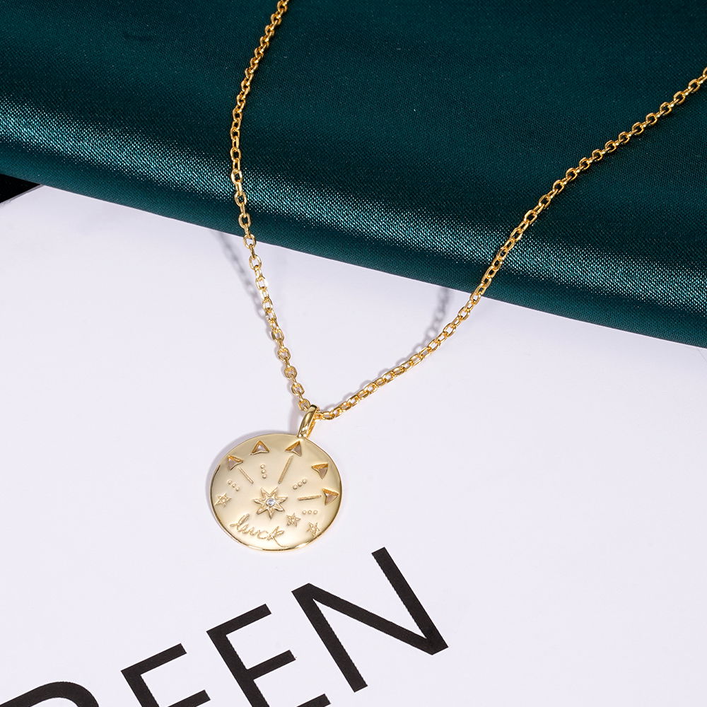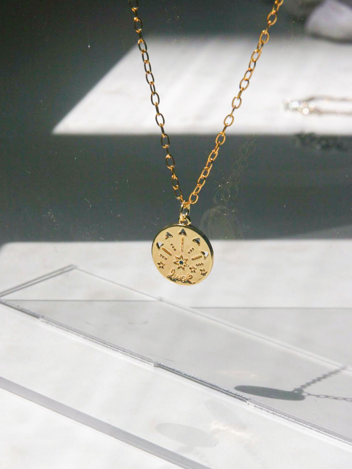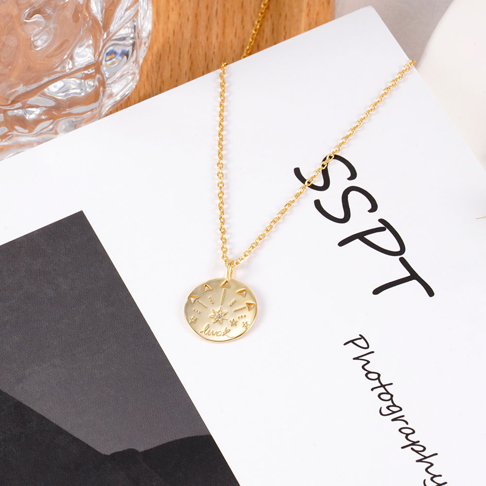 Este modelo destaca por su medalla circular con la palabra "luck" (suerte) grabada