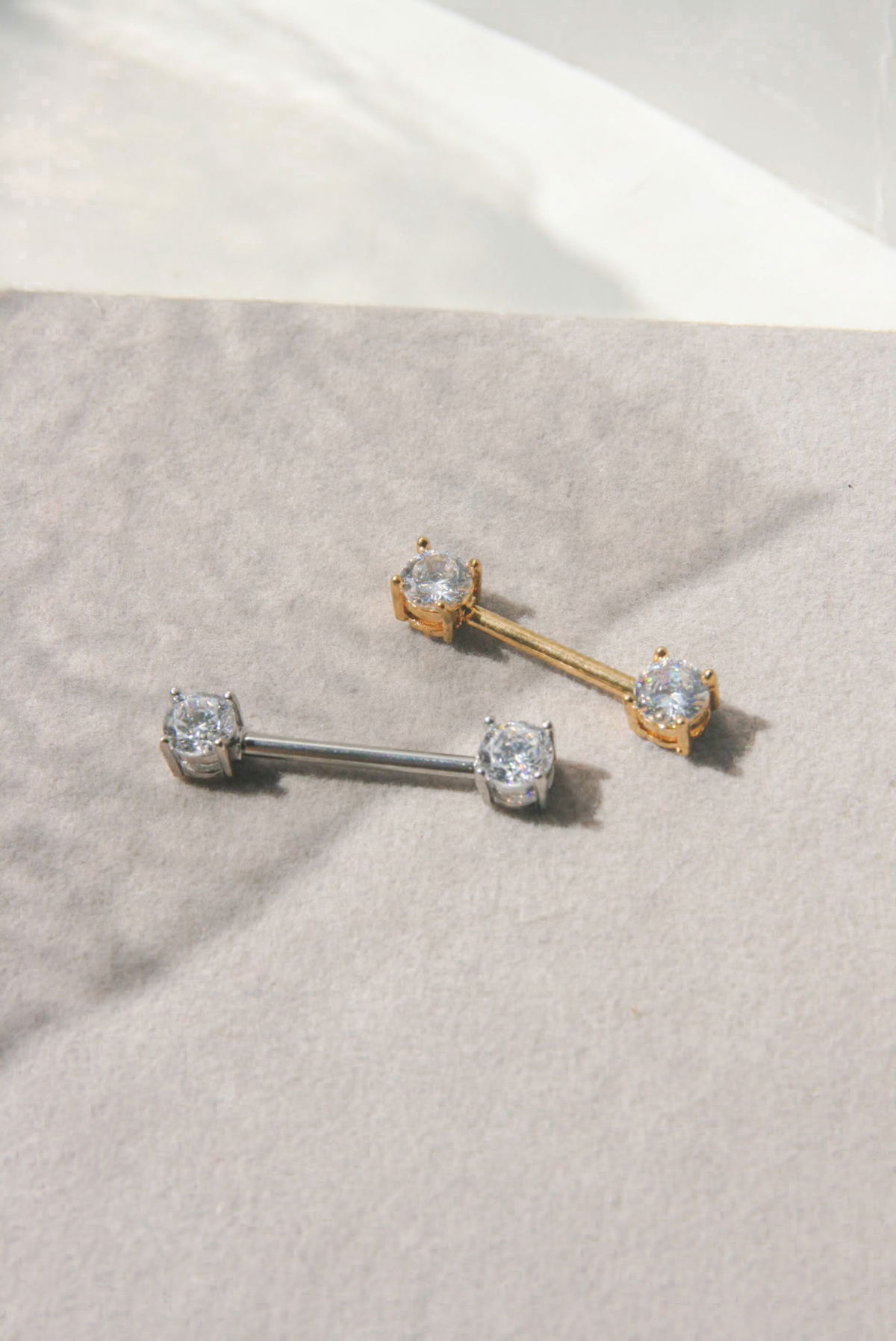 Piercing para el pezón con cubic blanco engarzado. Este tipo de piercing se puede usar en la perforación del pezón