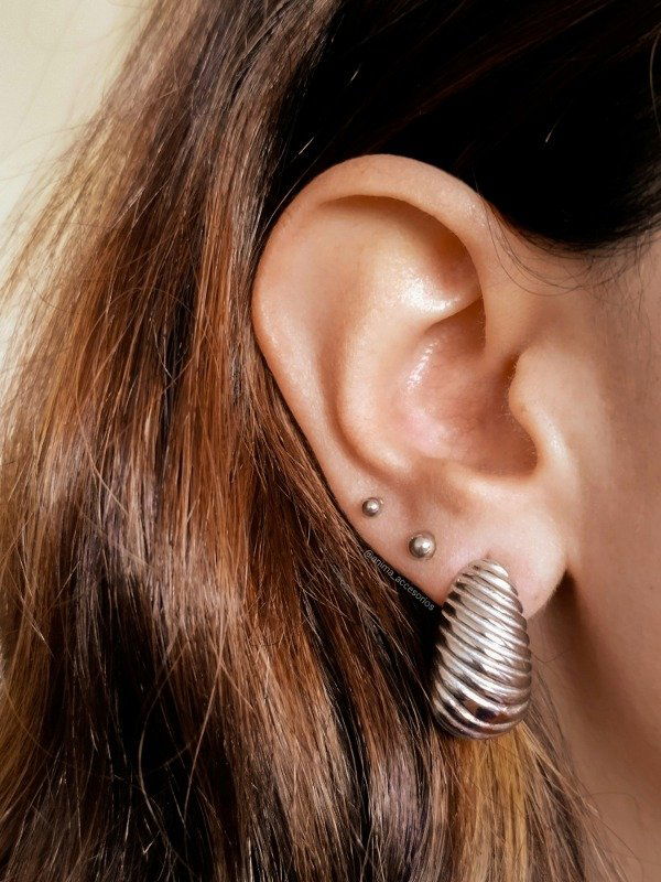 Aros pasantes con forma de gotita con detalles. Este modelo está pensado para la primera combinación y queda muy lindo combinado con aros pasantes en diferentes tamaños