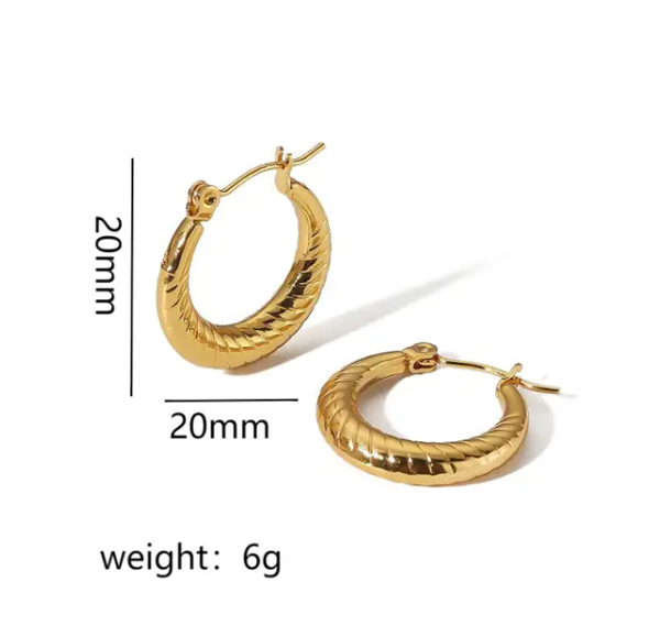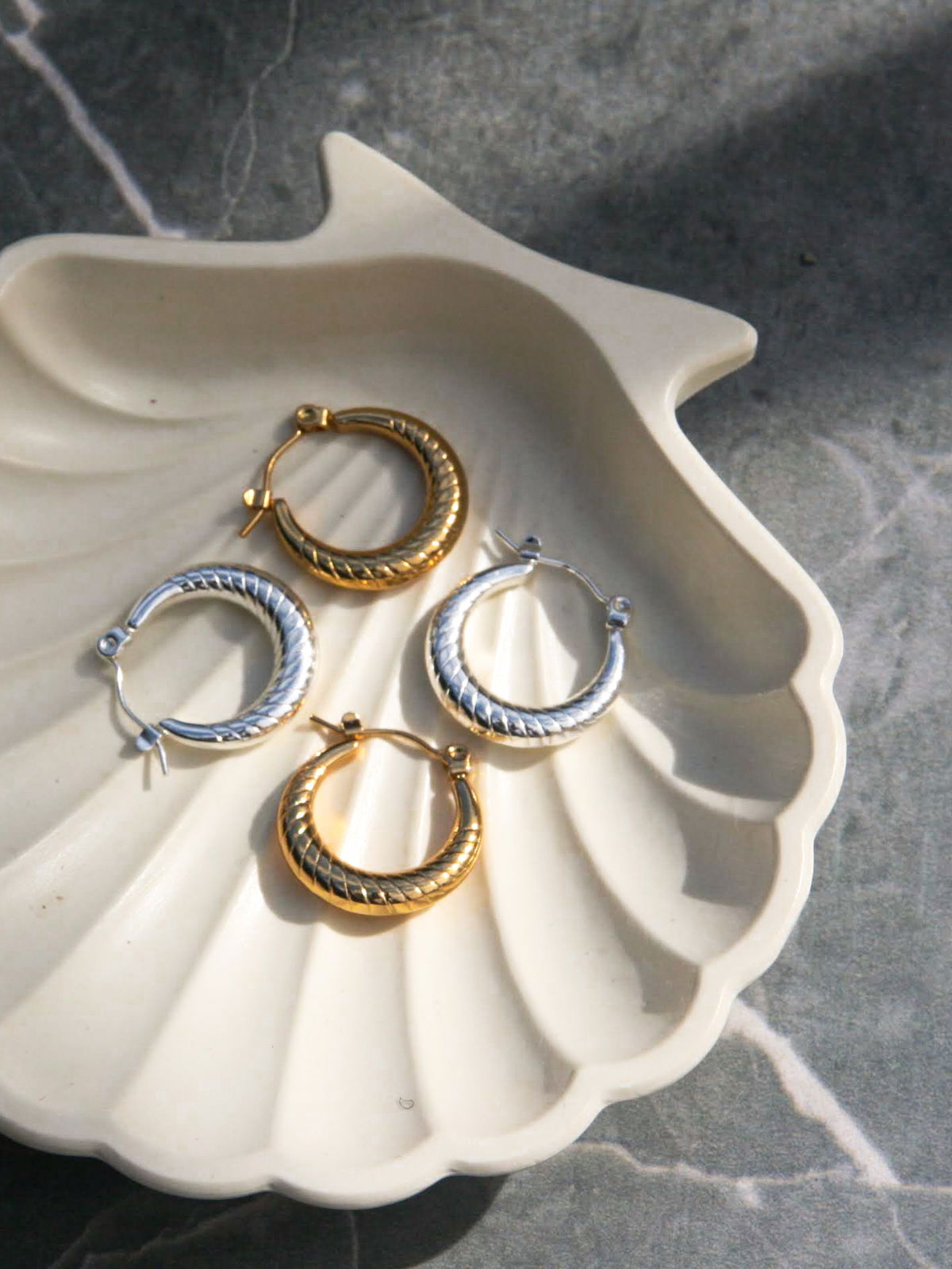 Argolla infladas planas con detalles. Ideales para todos los días. Este modelo se puede utilizar en las perforaciones: 1er, 2do lóbulo (ver foto abajo)