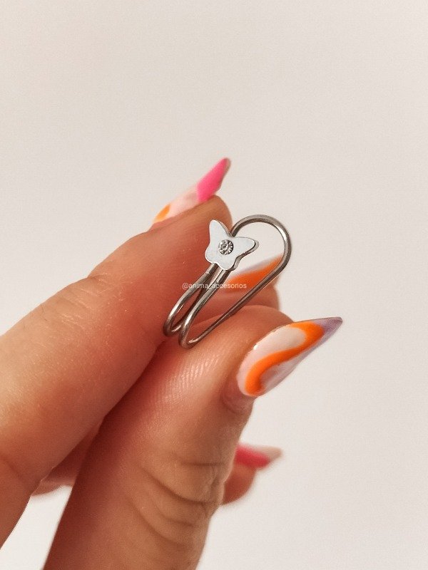 Un elegante ear cuff con mariposita cubic. Con este piercing ¡no necesitas hacerte más agujeros! ✨ Son modelos a presión, podes usarlos en el cartílago (simulando perforación hélix) o en el medio de la oreja (simulnado perforación conch)