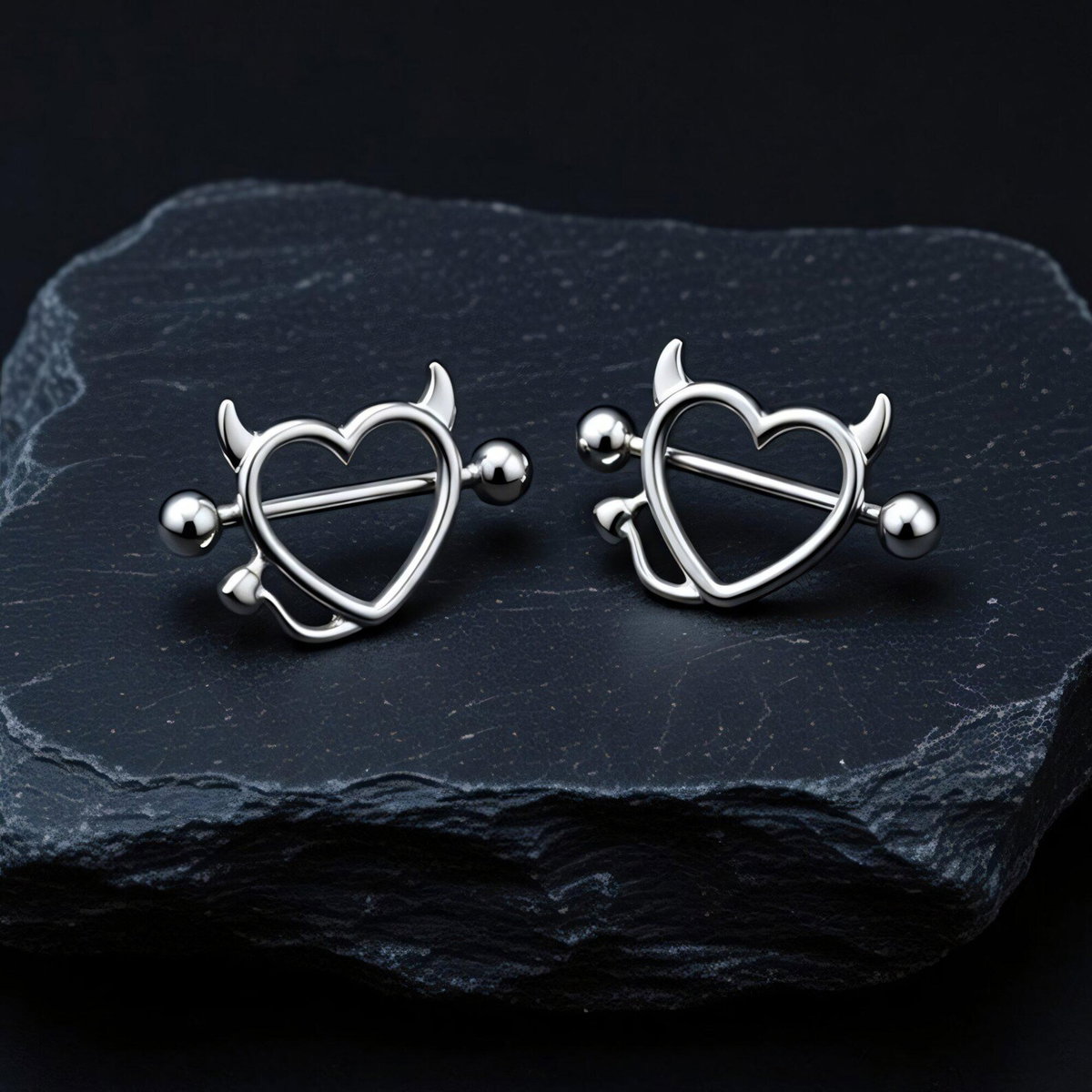 Barbell recto clásico con corazón con cuernitos y cola de diablita. Podes usarlo con o sin el aplique del corazón! Este tipo de piercing se puede usar en la perforación del pezón