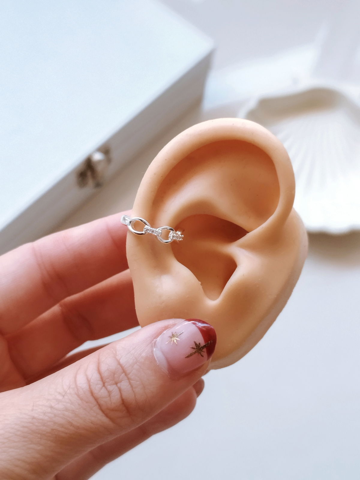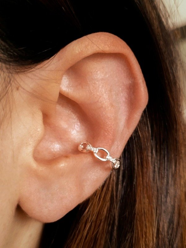 Un elegante ear cuff circonitas blancas con estilo eslabones de cadena. Con este piercing ¡no necesitas hacerte más agujeros! ✨ Son modelos a presión, podes usarlo en el medio de la oreja (simulnado perforación conch)