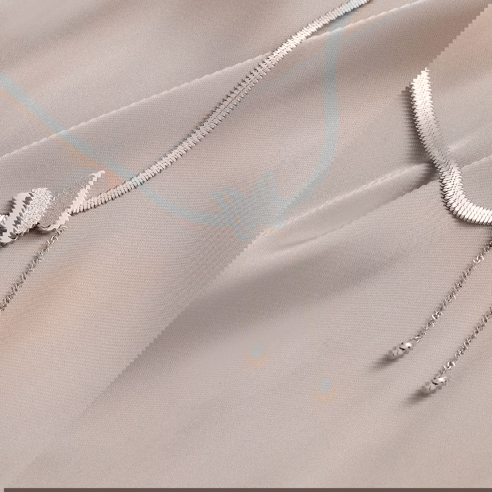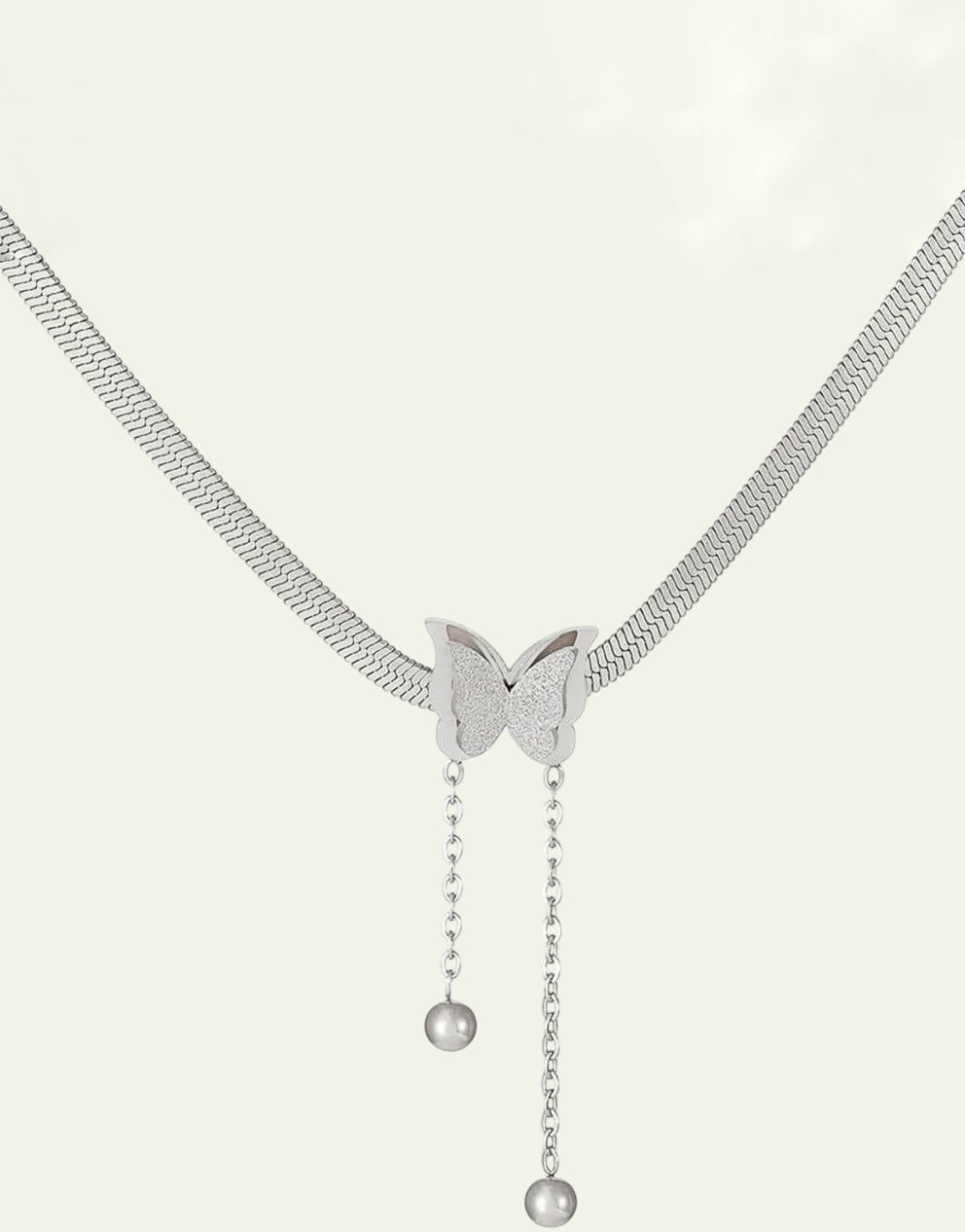 El collar aixa está diseñado con nuestra cadena snake y un dije de mariposa super lindo con cadenas colgantes y bolita
