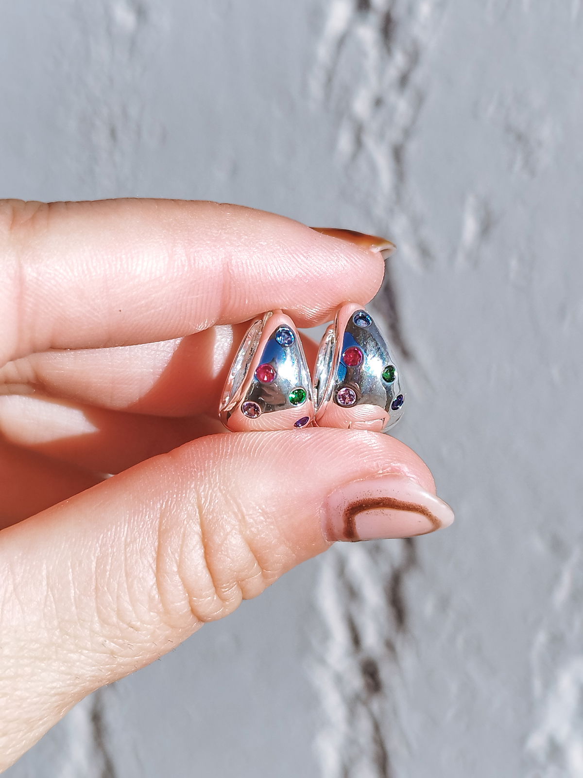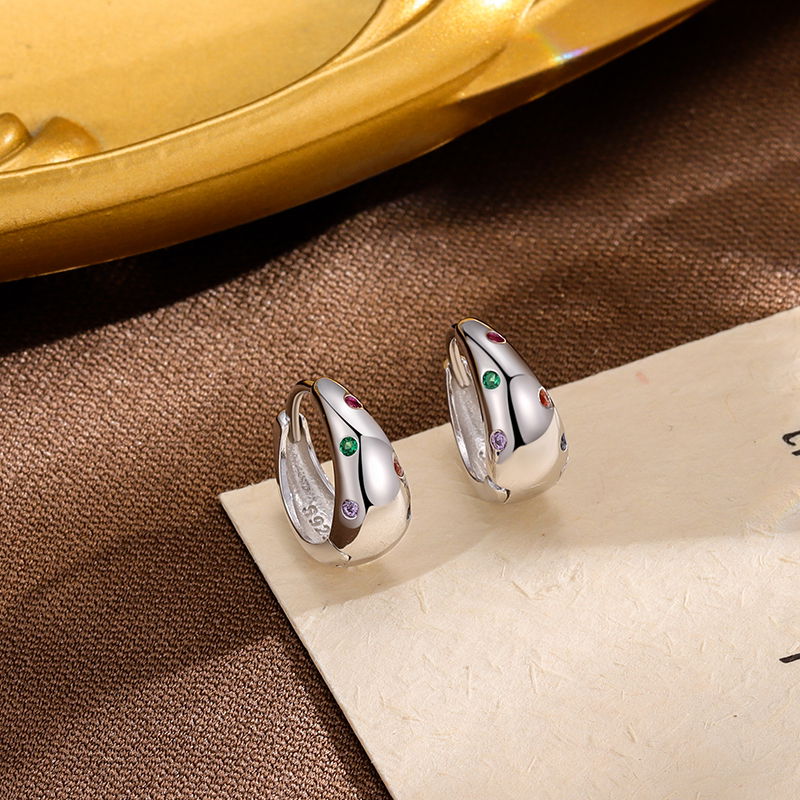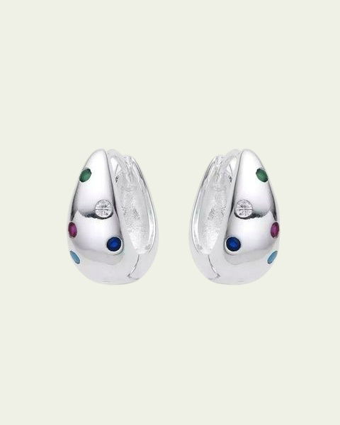 Argolla estilo huggie anchas con cubics de colores. Este modelo se puede utilizar en las perforaciones: 1er, 2do y 3er lóbulo (ver foto abajo)